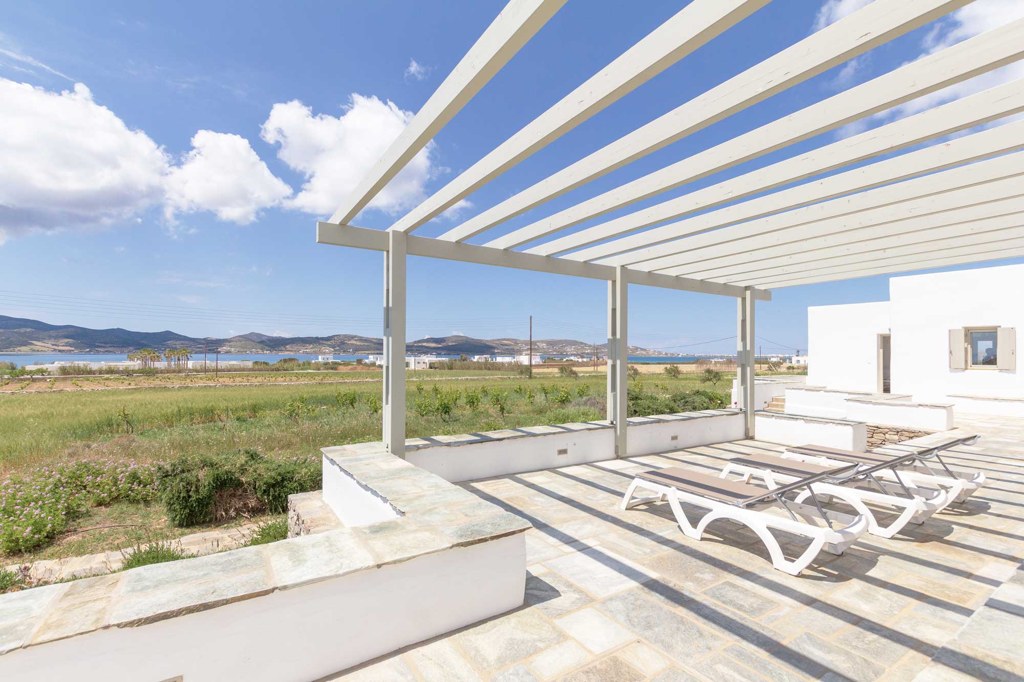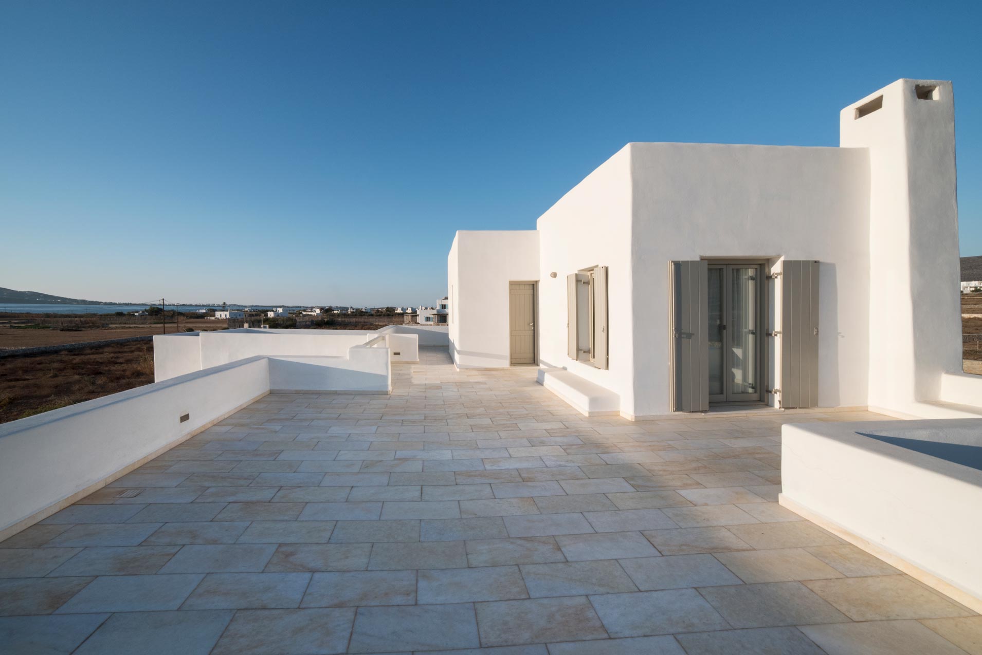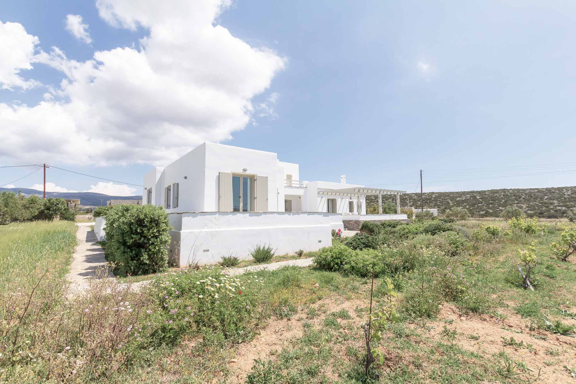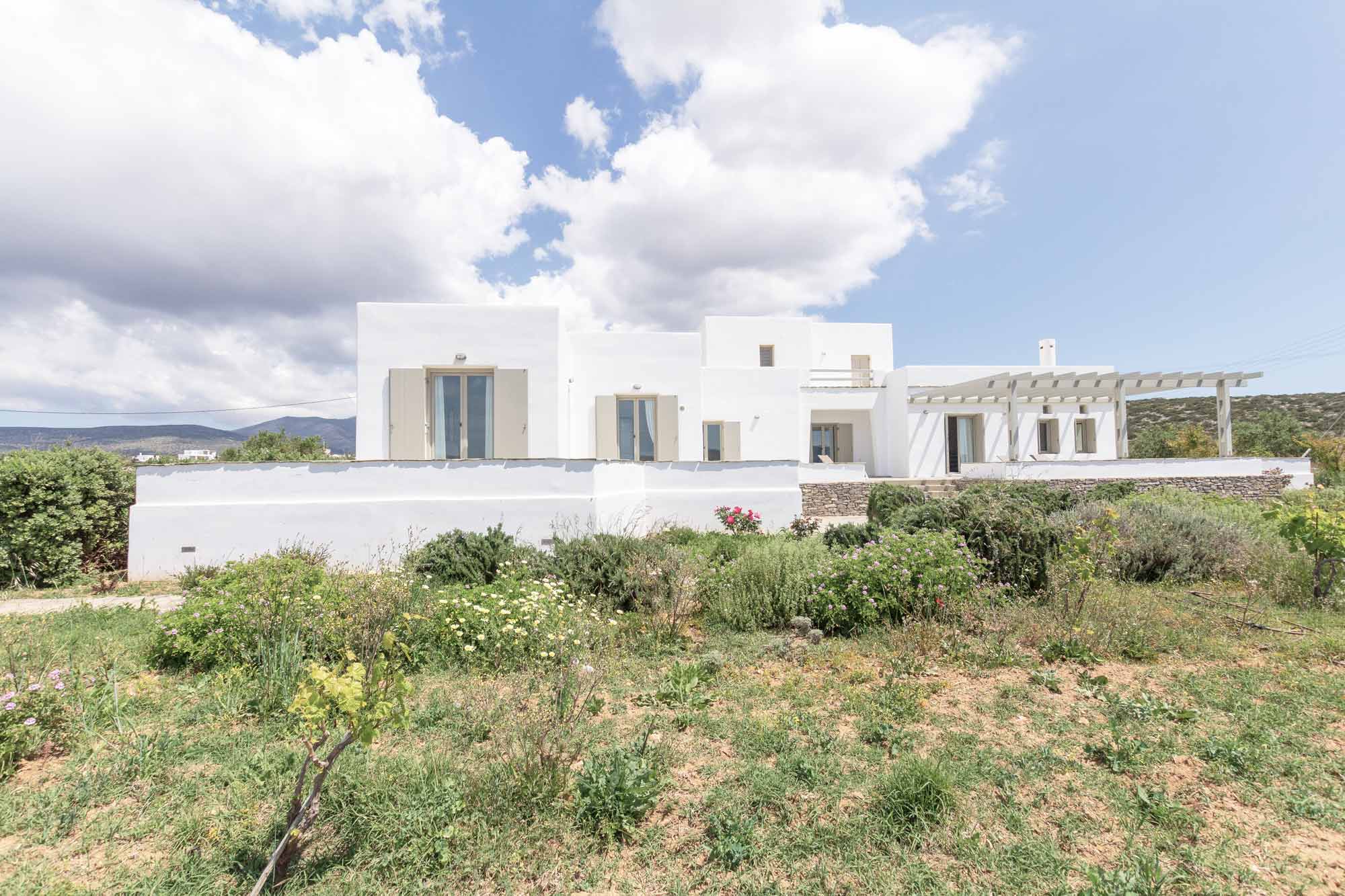 Externally, the purity of white and clean lines dominate. Celia Villa is surrounded by a well-kept garden and a cute yard with low vegetation, which blends perfectly with the surrounding natural environment of the summer Parian landscape.