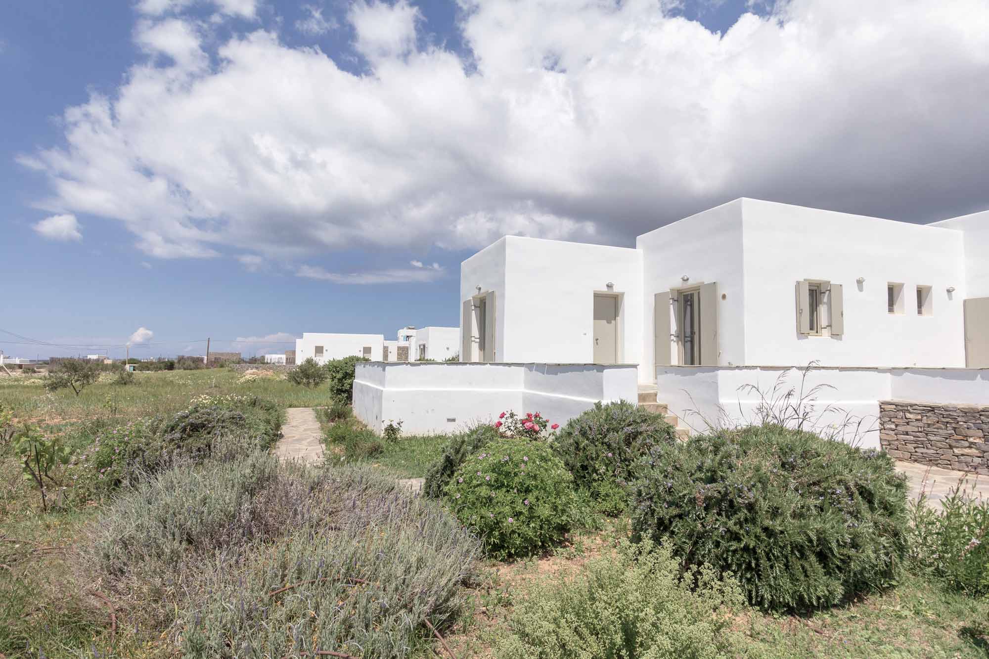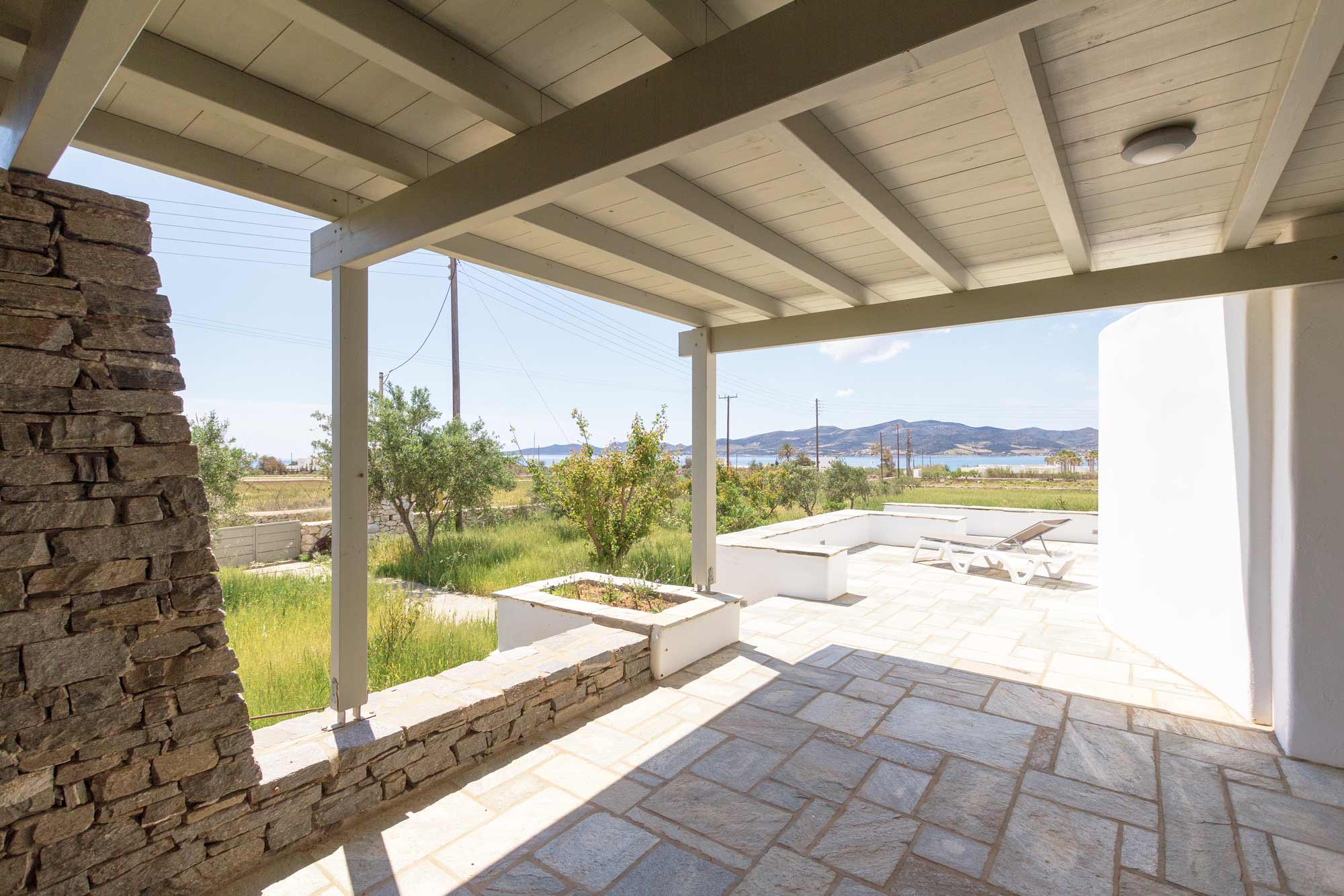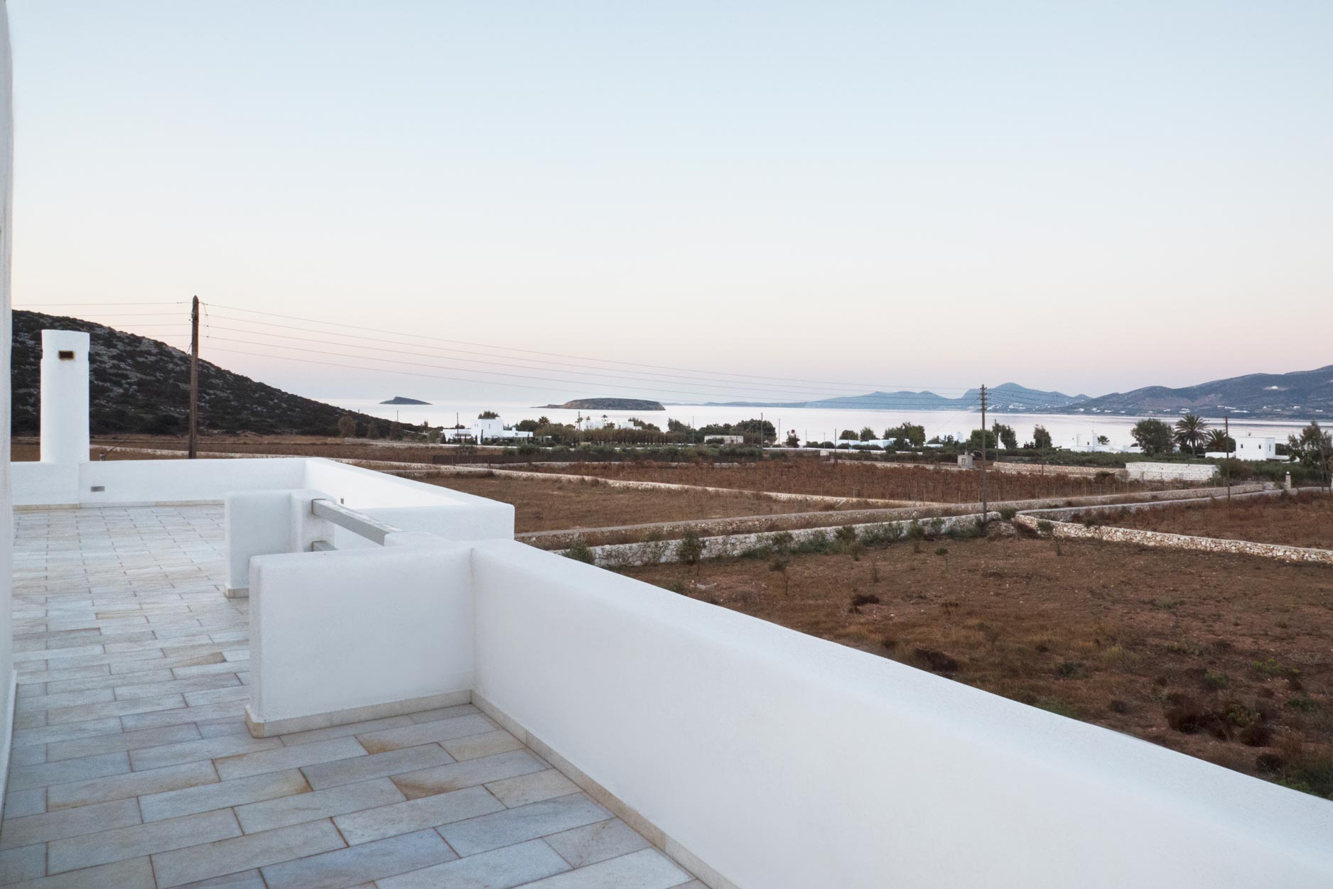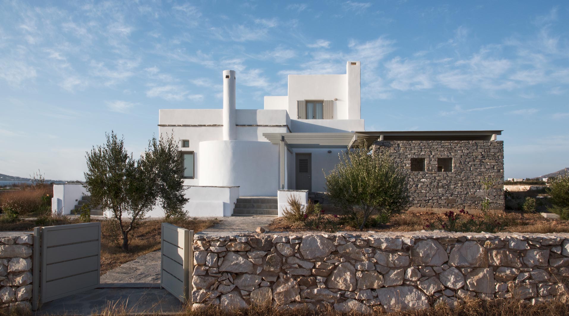 Externally, the purity of white and clean lines dominate. Celia Villa is surrounded by a well-kept garden and a cute yard with low vegetation, which blends perfectly with the surrounding natural environment of the summer Parian landscape.