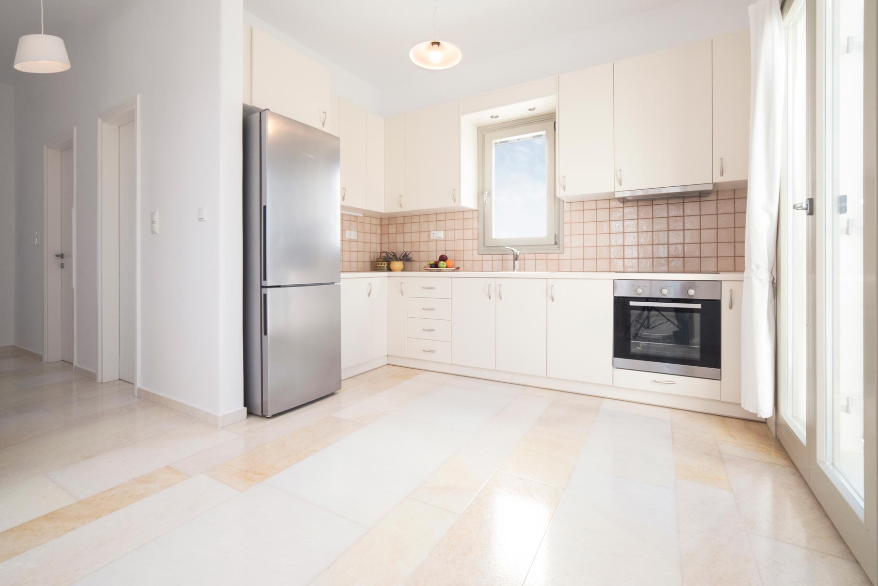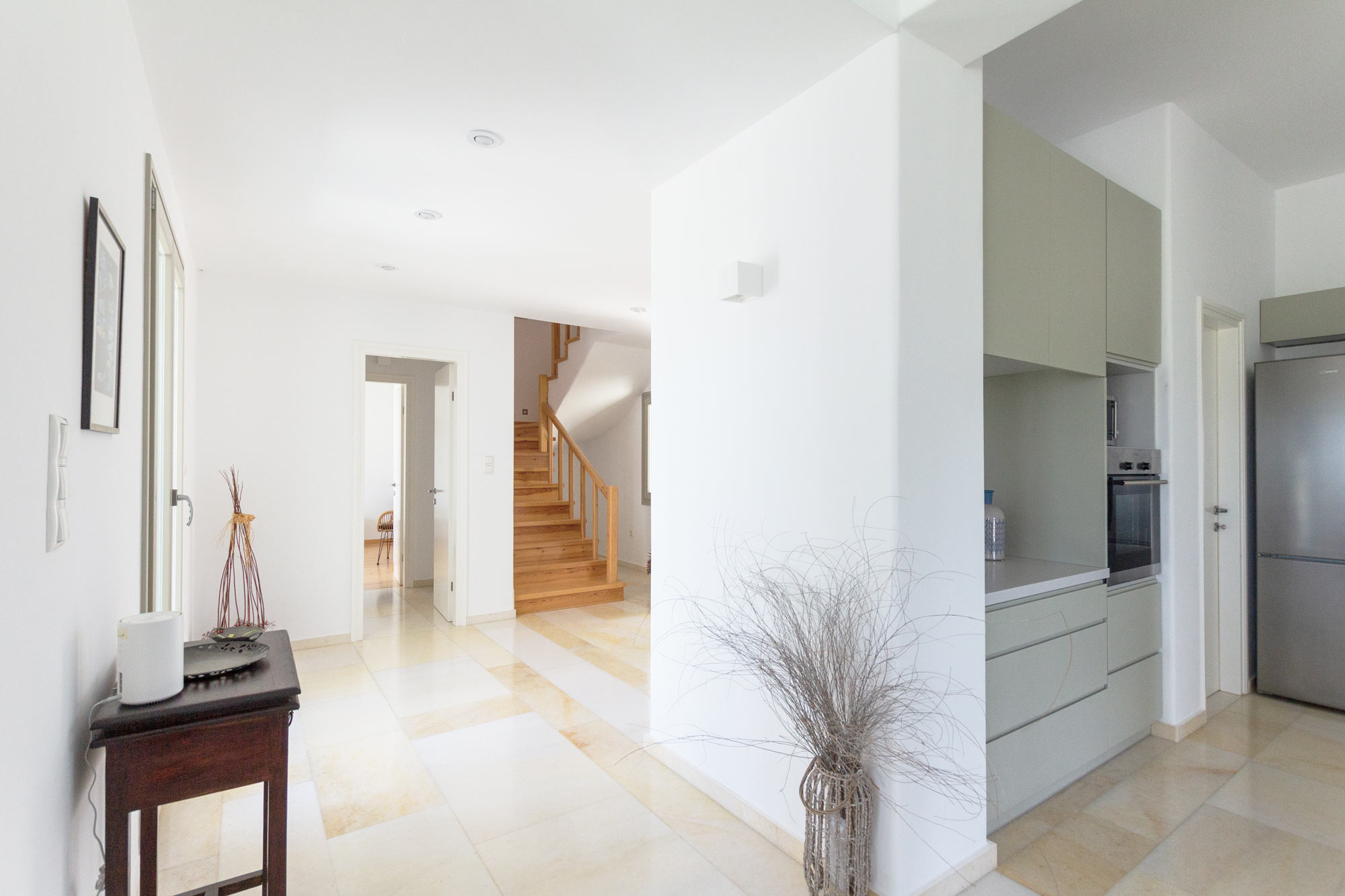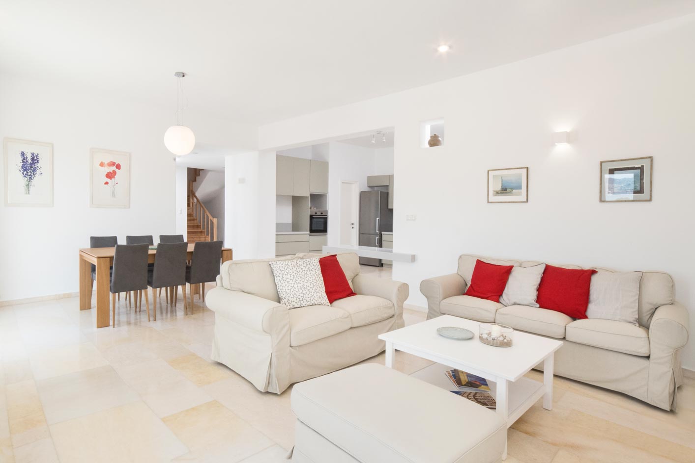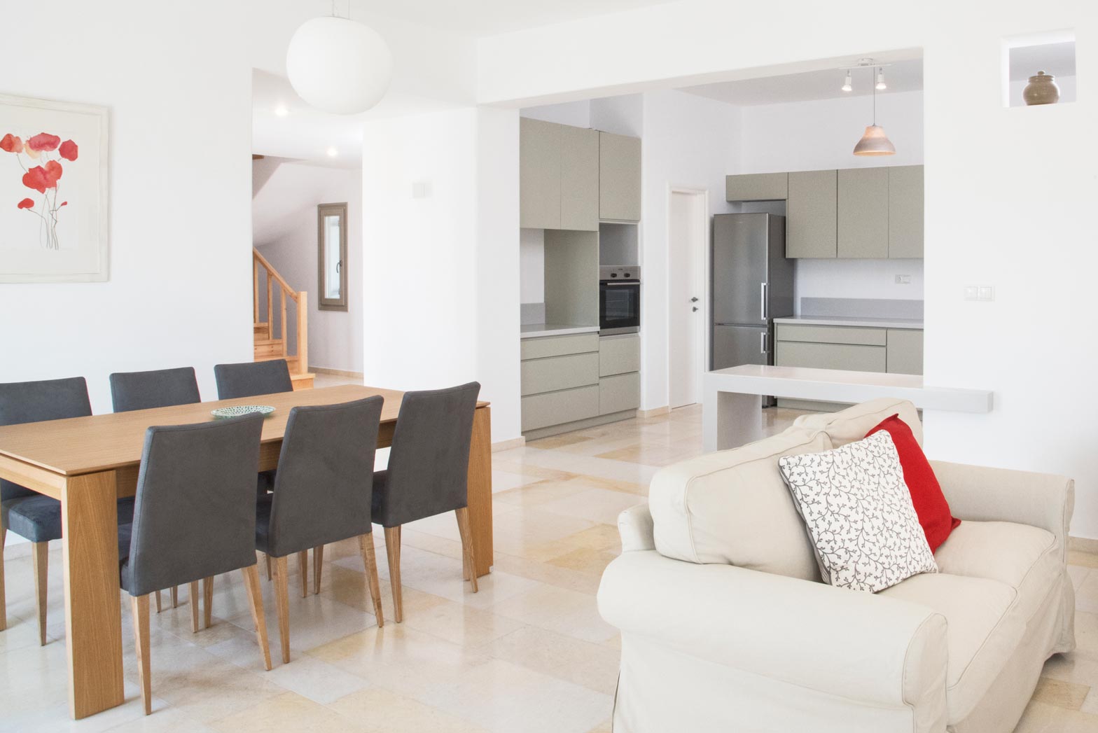 Moving indoors, the house exudes cleanliness and comfort, as it offers large and bright spaces. The sophisticated living room with its elegant fireplace is undeniably a space you will love spending time at, when you decide to leave the outside view of the blue for a while. The refined dining room and the fully equipped modern kitchen complete the picture.