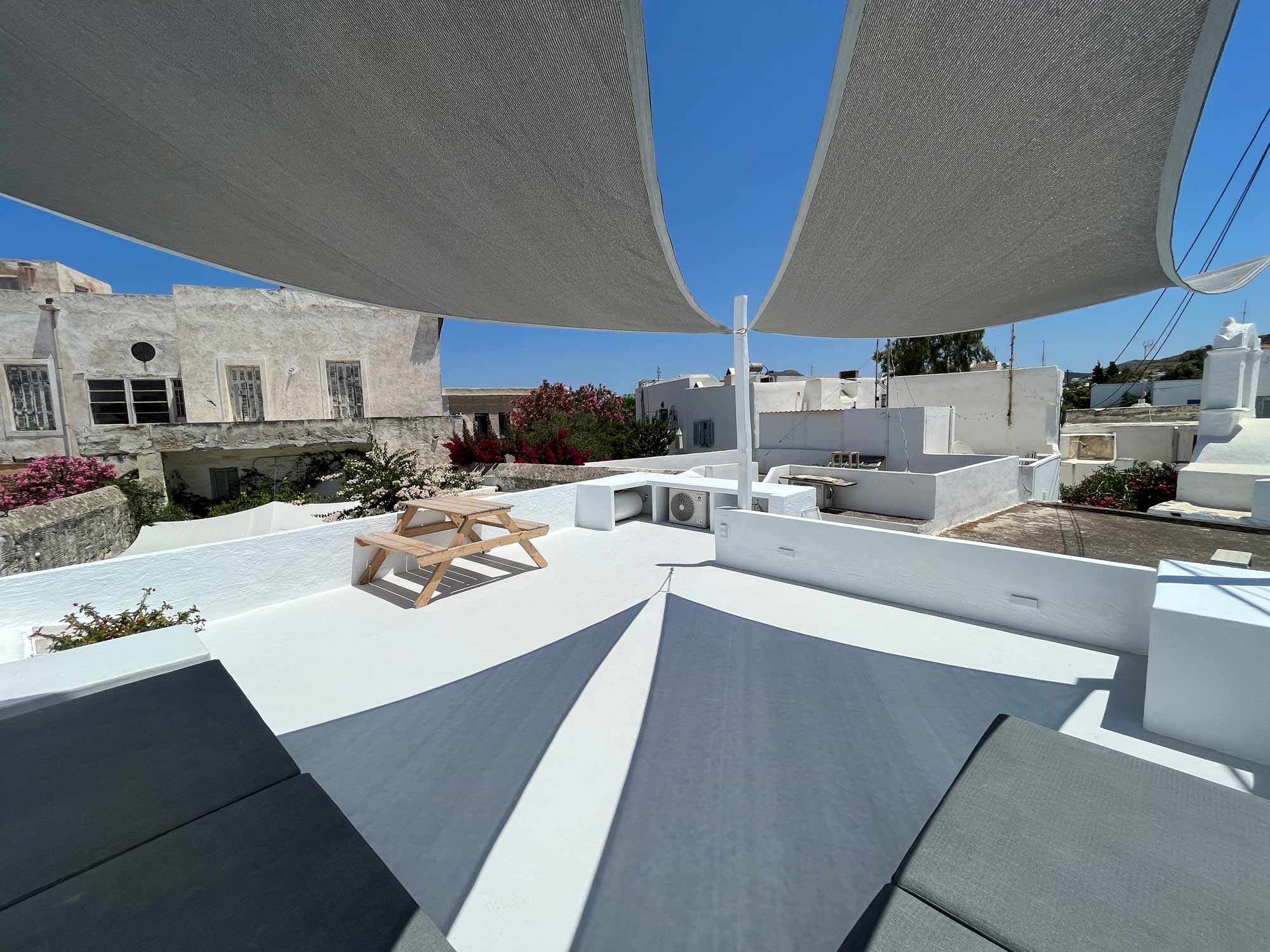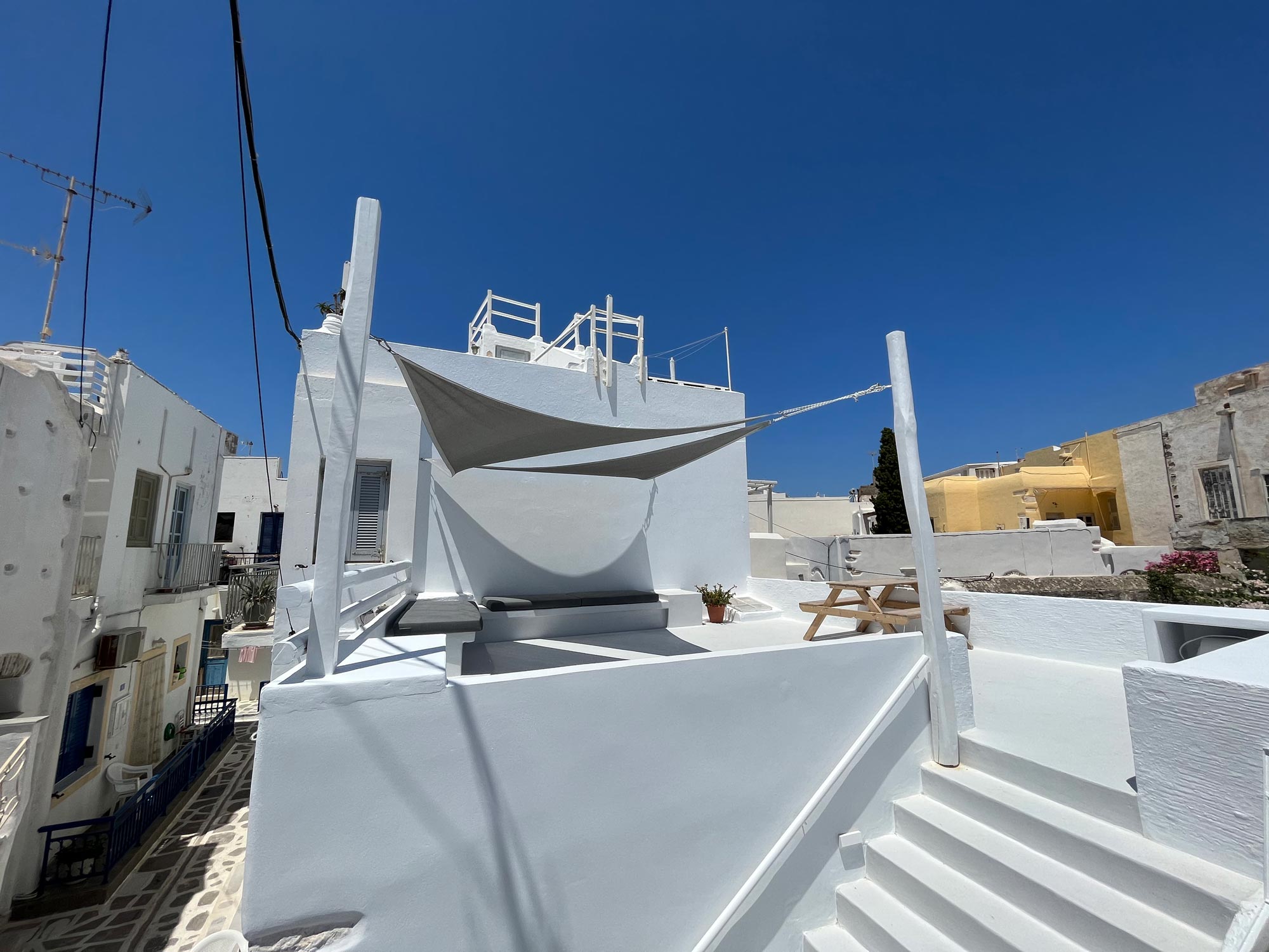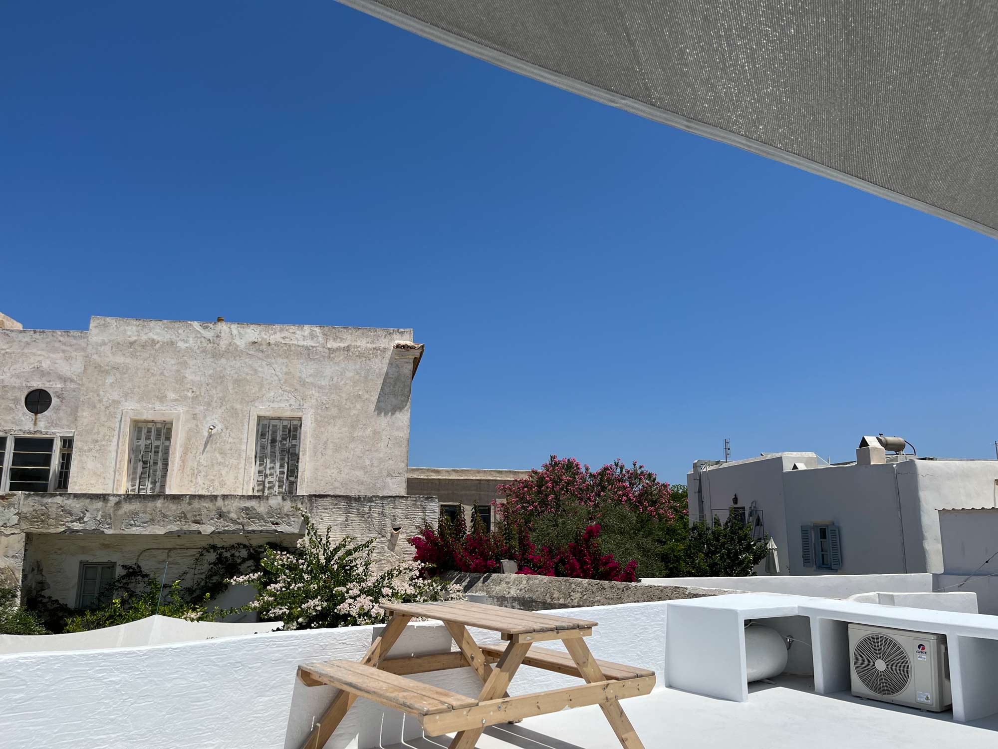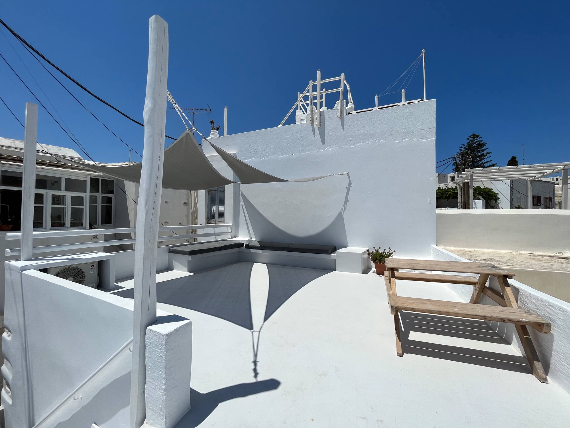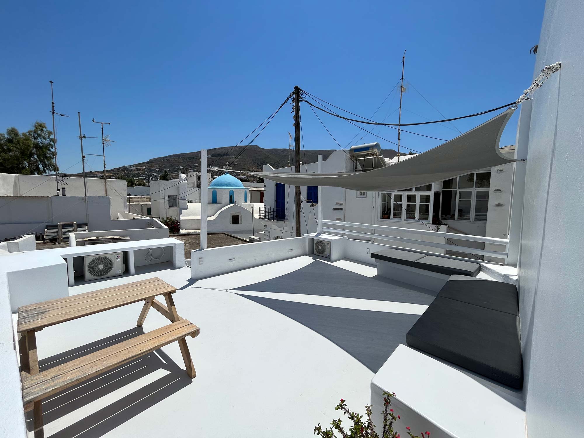 Joyanne has a lovely modern rooftop, which is private and accessible by an external staircase. Relax in the outdoor lounge and enjoy the tranquility and the view of the characteristic blue dome of the Cycladic church sited a few meters away.