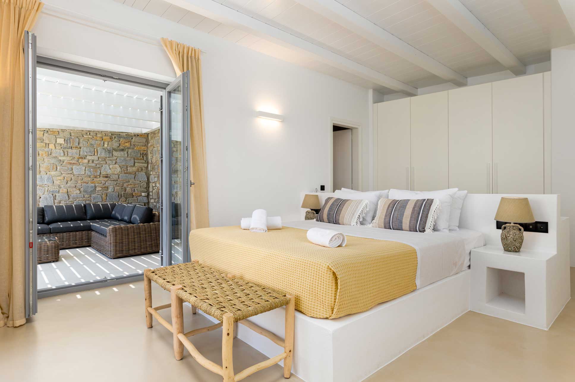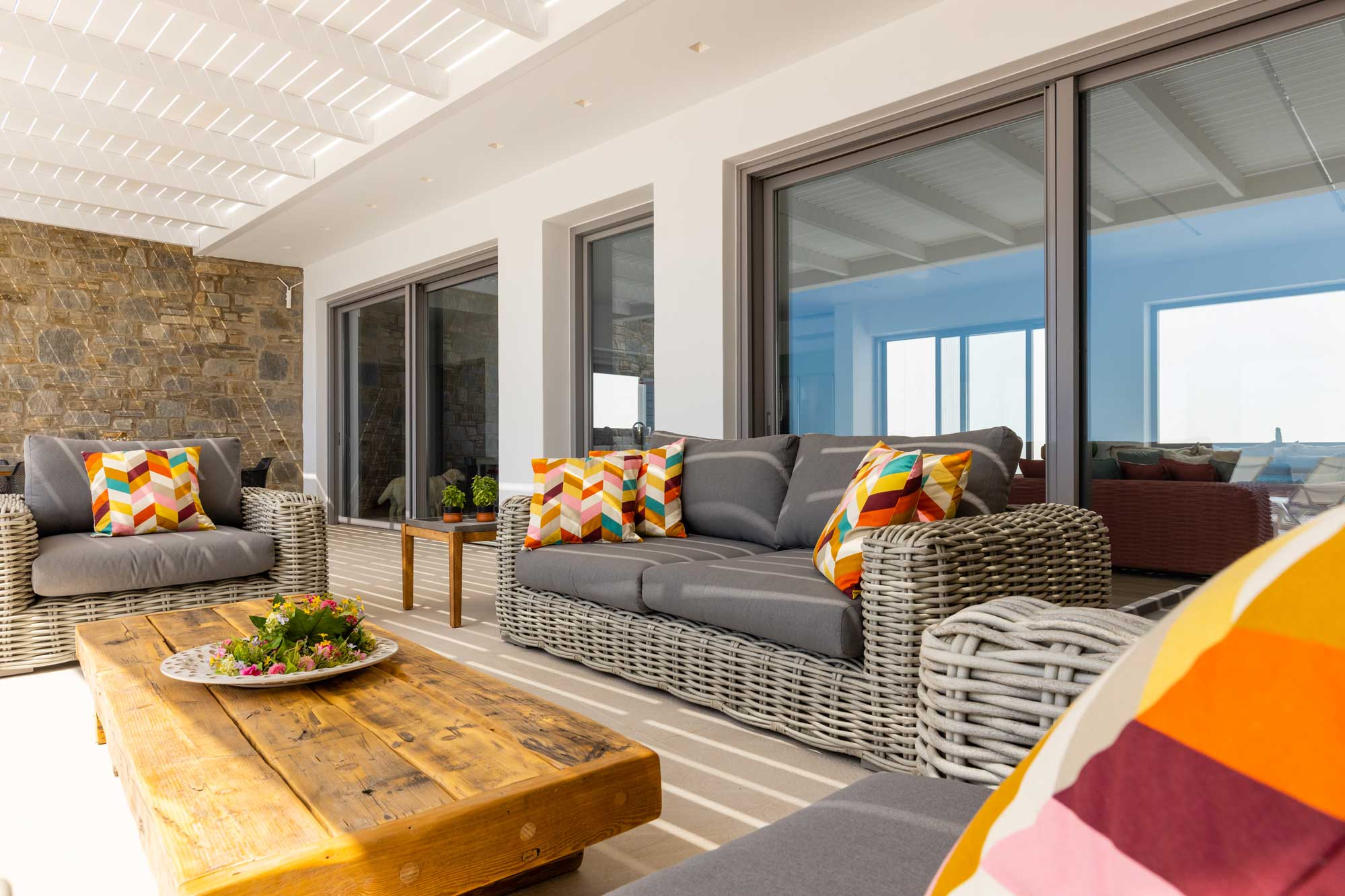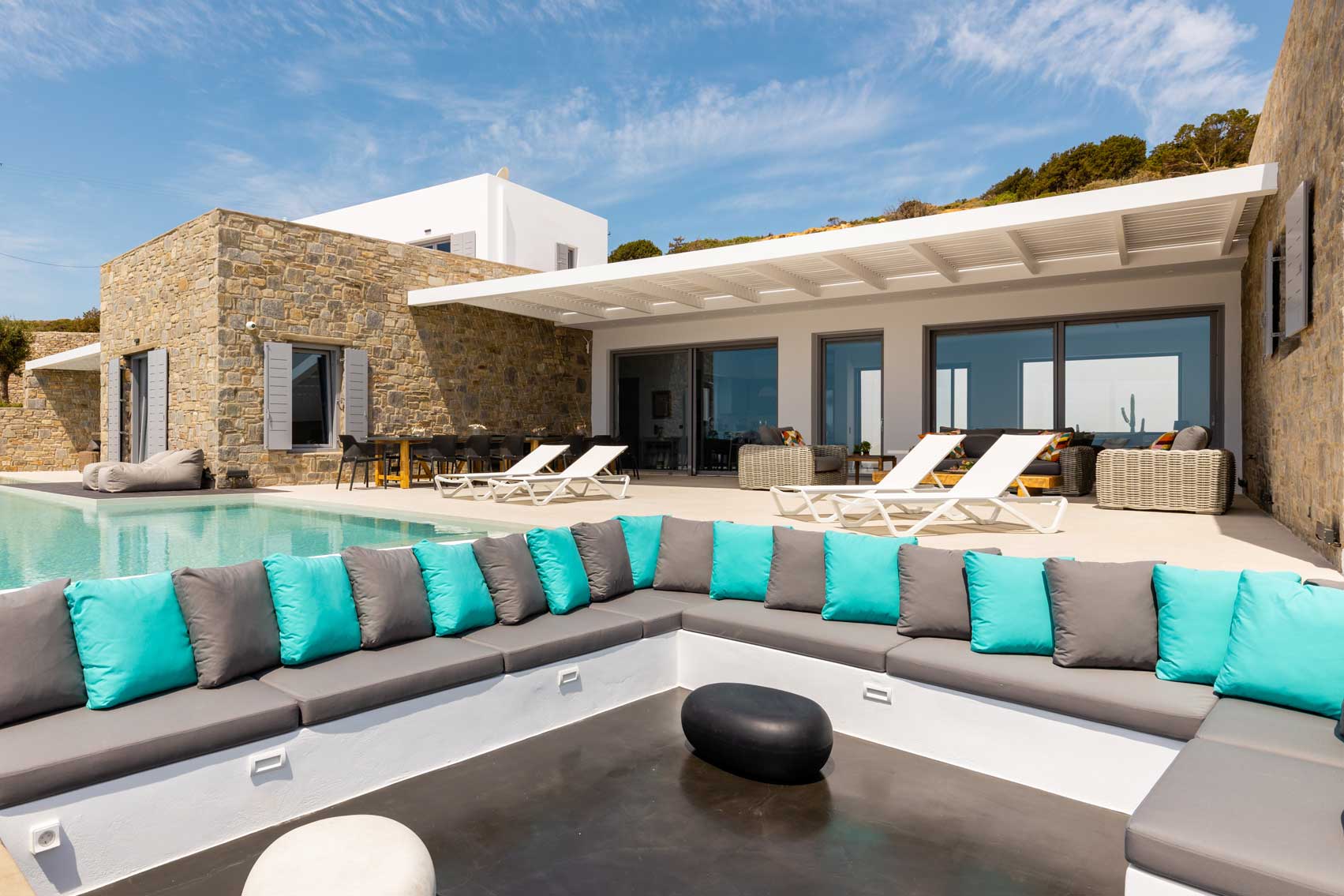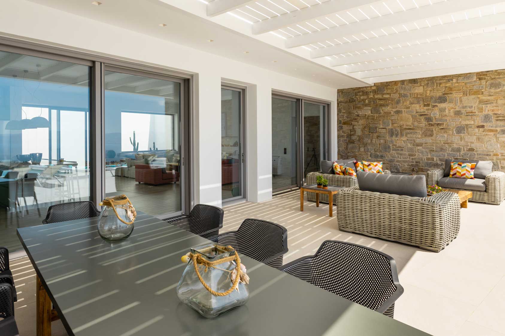 The large glass doors of this gorgeous home are designed to open at any time and let in a nice breeze. The dining table can seat 12 people comfortably, while the fully-equipped kitchen provides all that is needed for preparing food or drinks. There is also an impressive lounge area facing scenic views from inside out; it consists of a comfy couch space as well two stylish sofas, perfect if you want some relaxing downtime before heading back into the refreshing pool and the bright Cycladic sunlight.