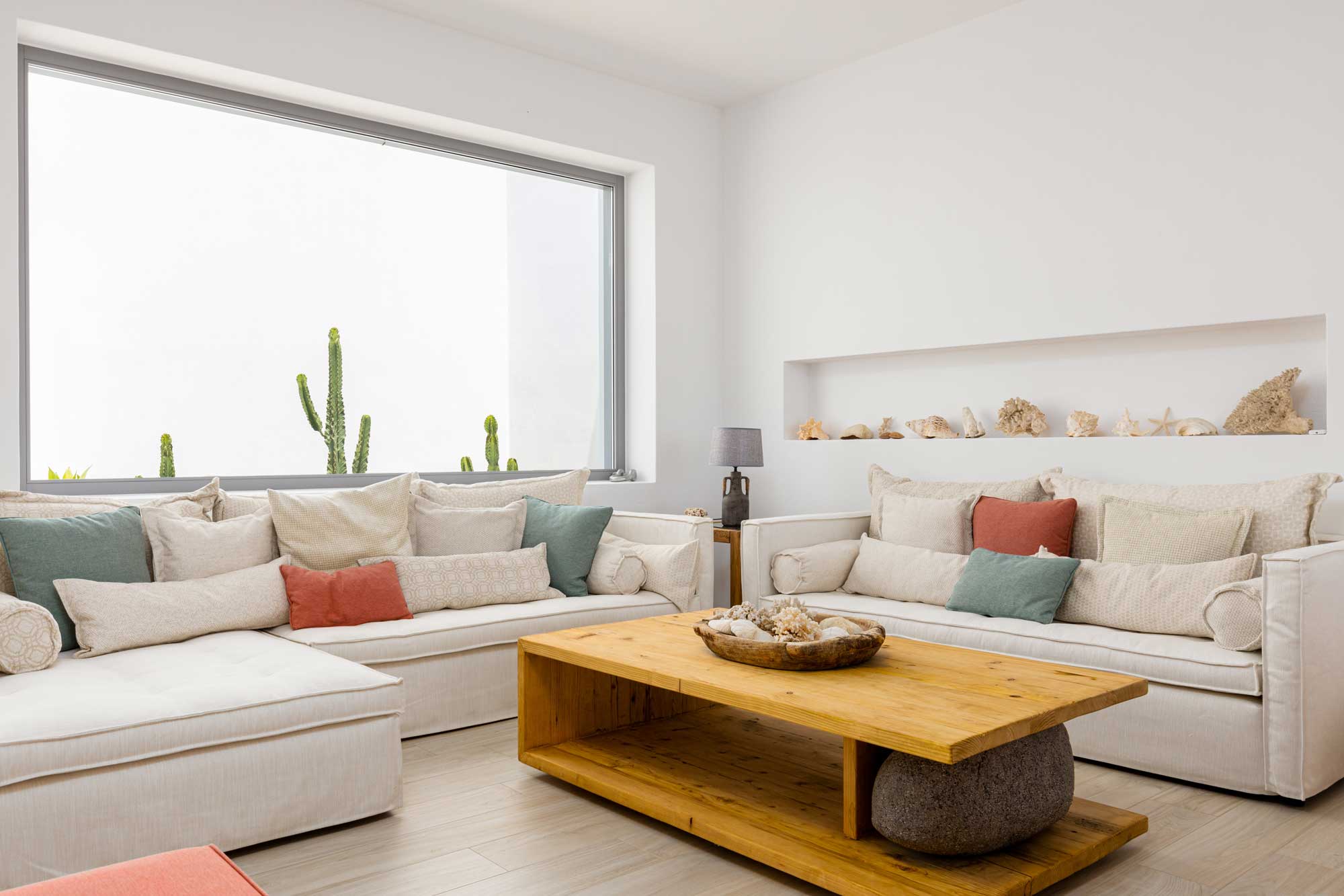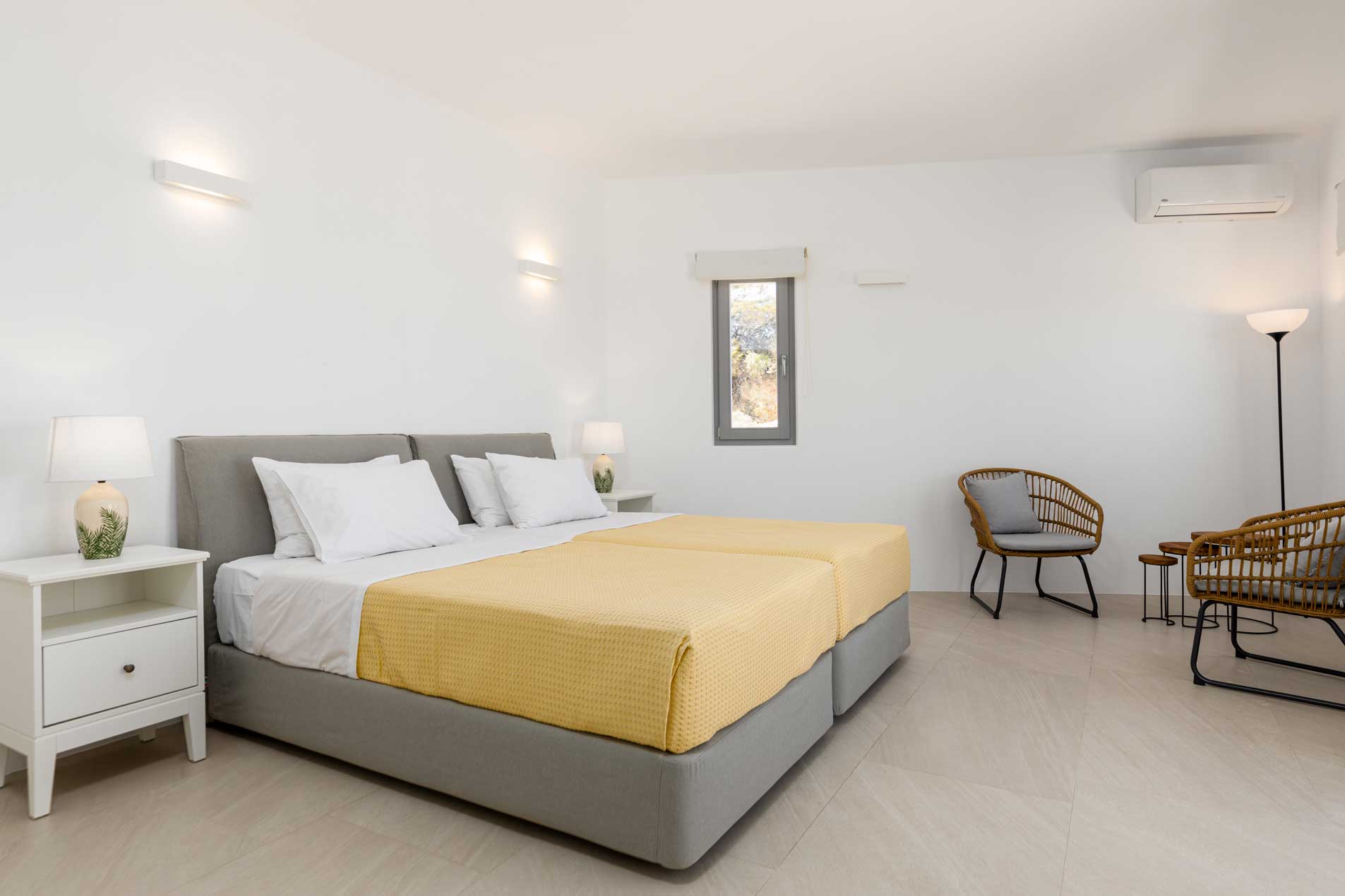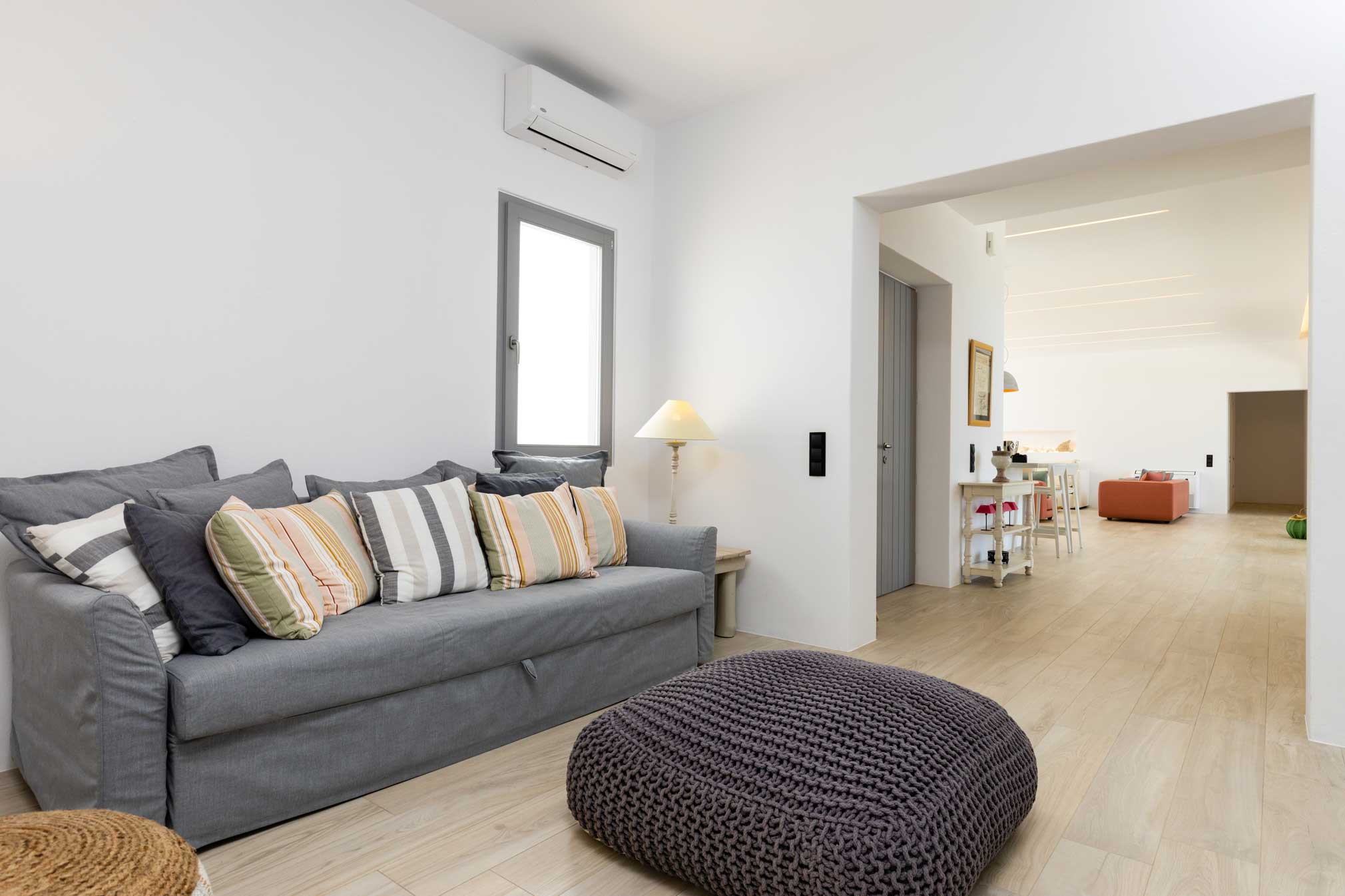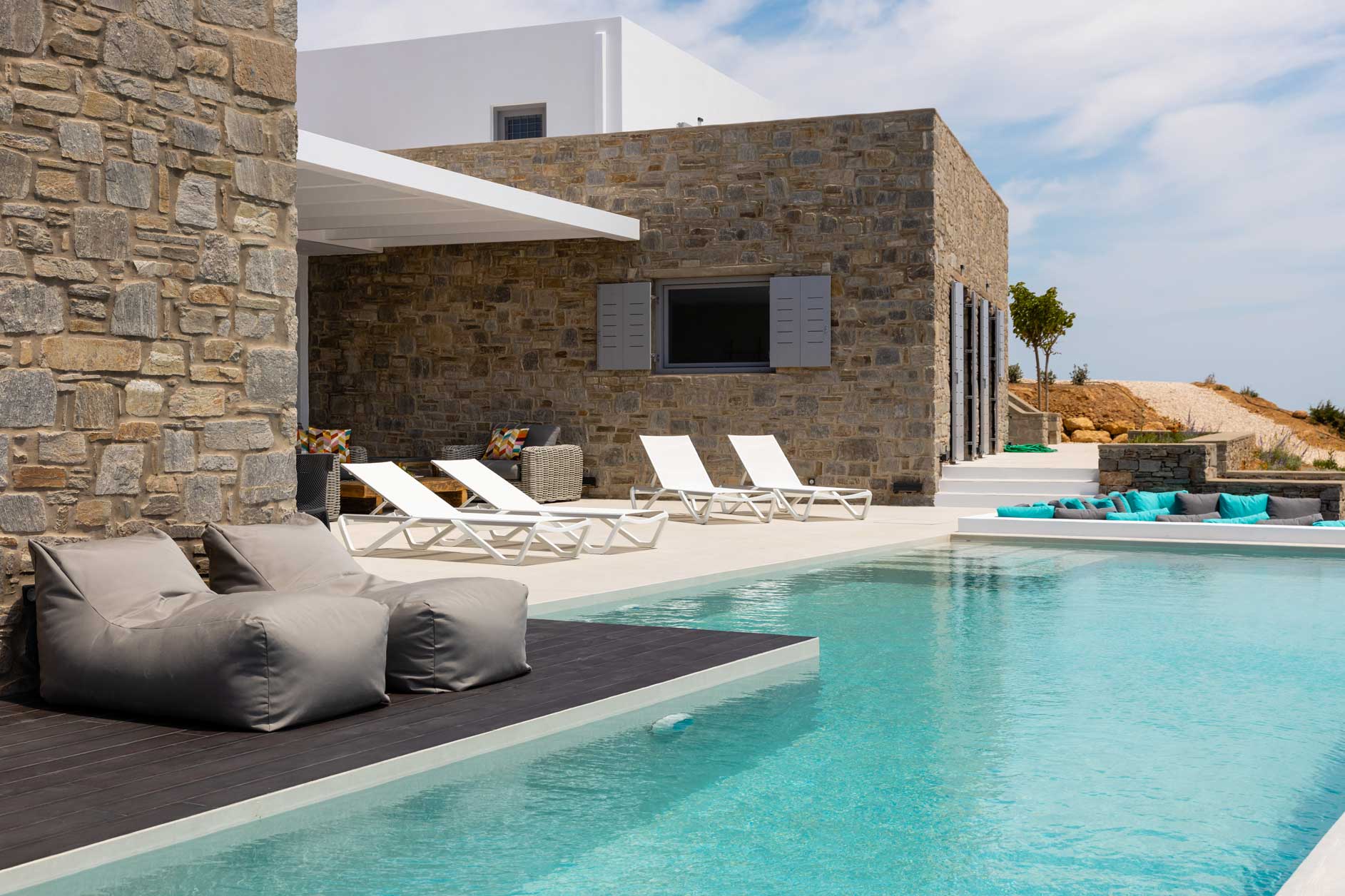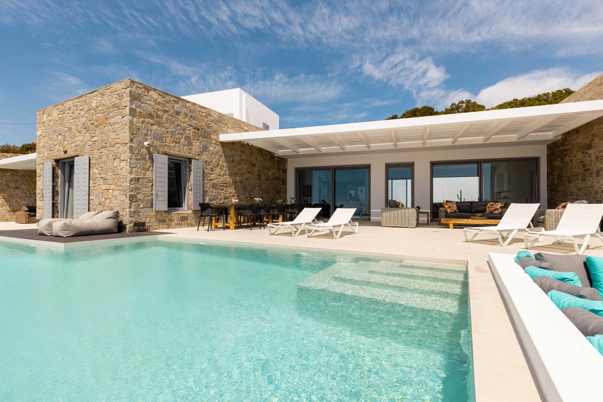 The large glass doors of this gorgeous home are designed to open at any time and let in a nice breeze. The dining table can seat 12 people comfortably, while the fully-equipped kitchen provides all that is needed for preparing food or drinks. There is also an impressive lounge area facing scenic views from inside out; it consists of a comfy couch space as well two stylish sofas, perfect if you want some relaxing downtime before heading back into the refreshing pool and the bright Cycladic sunlight.