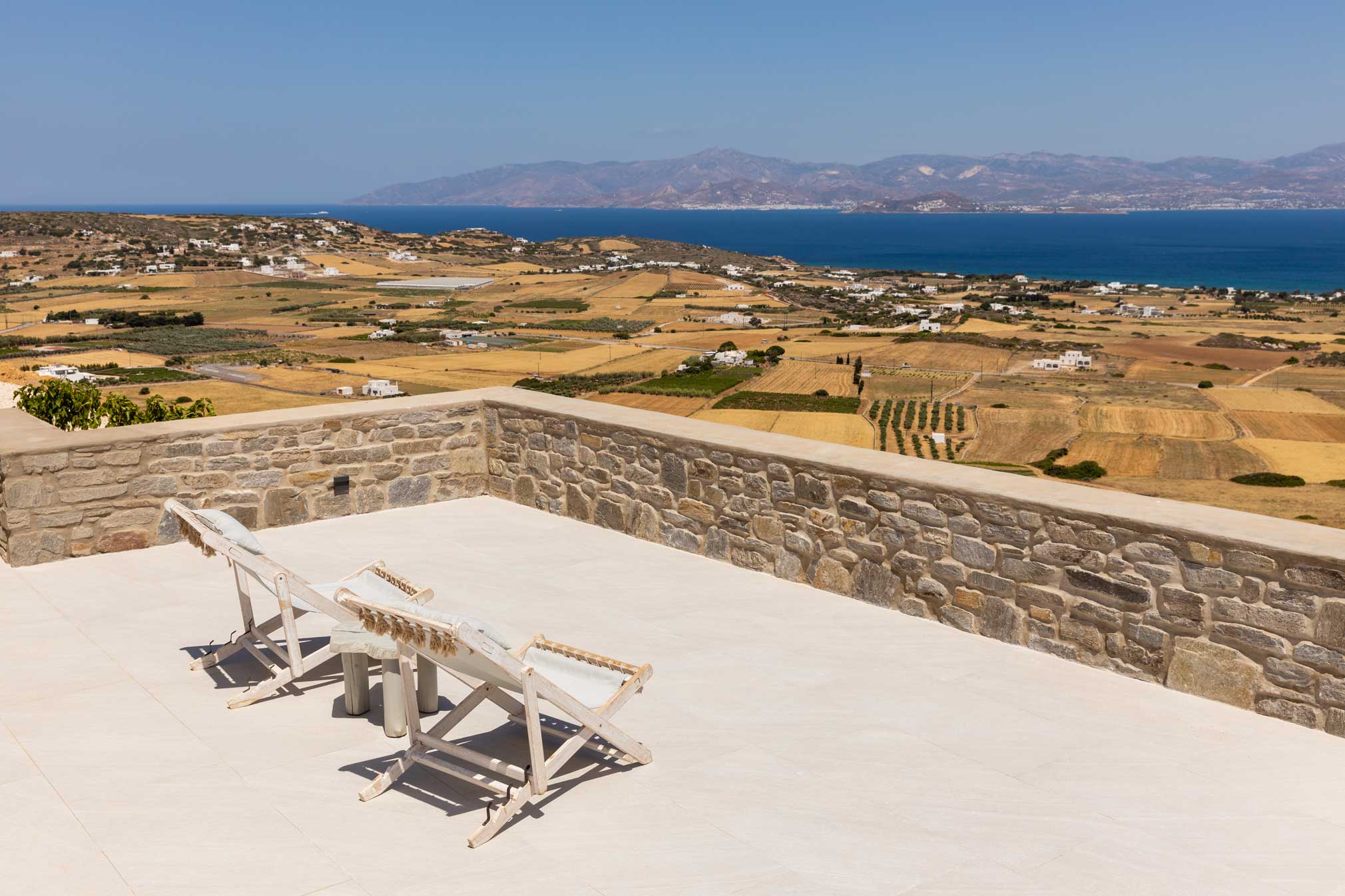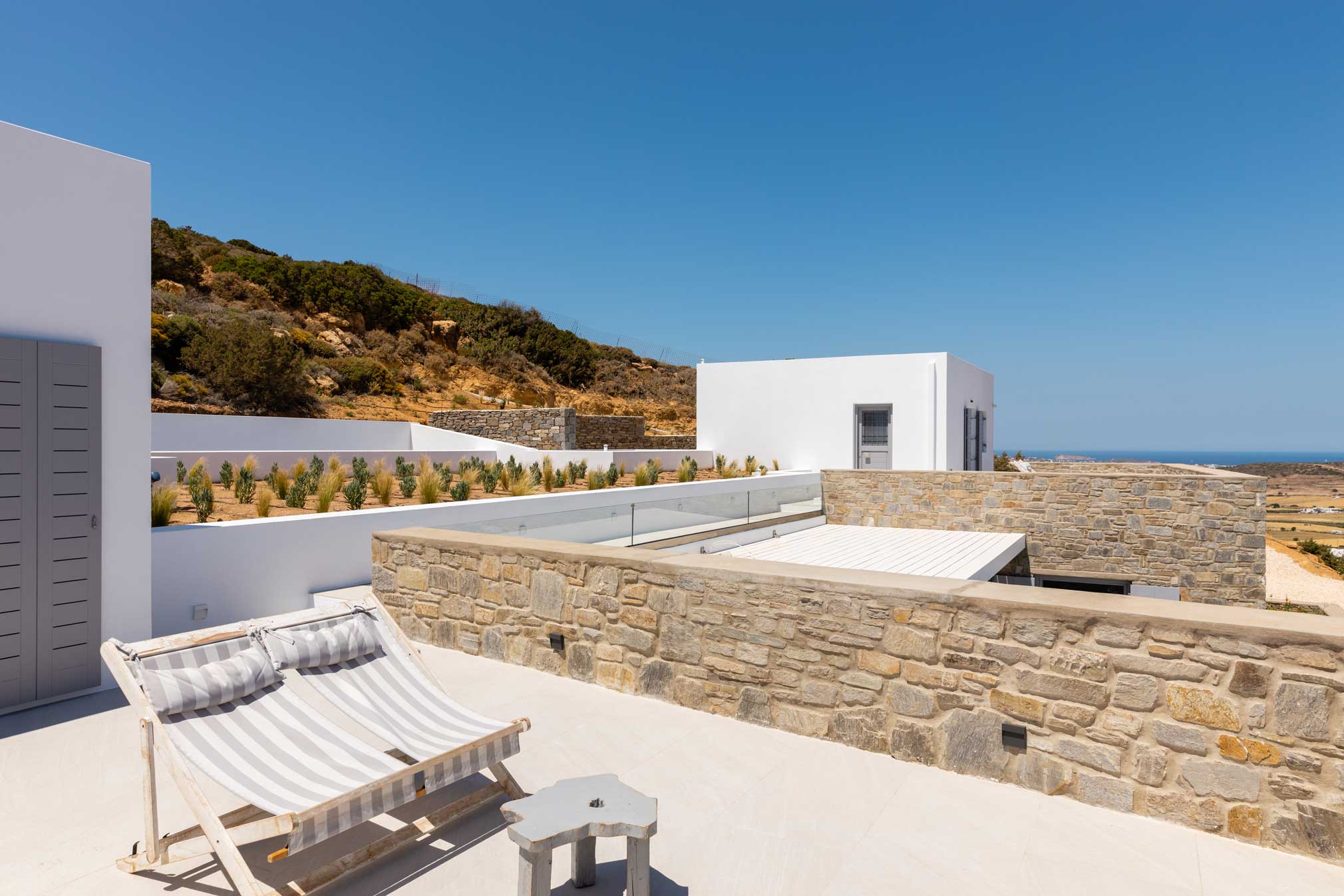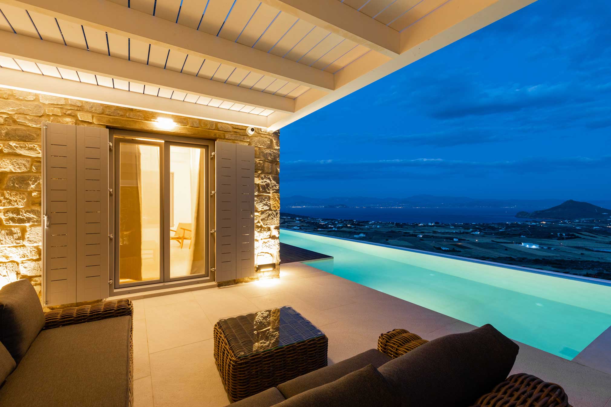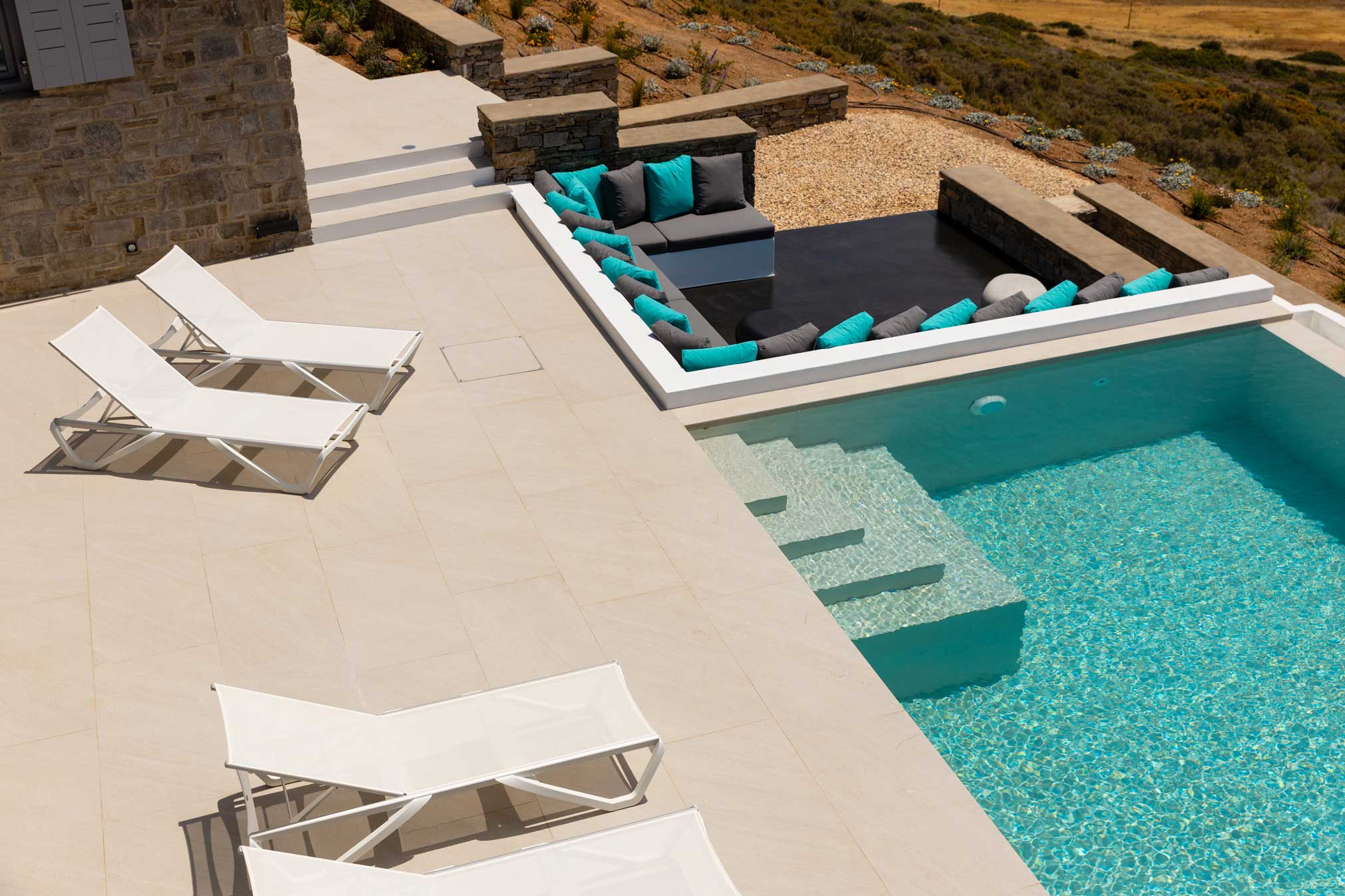 The view from the pool area is absolutely breathtaking! You can see both Paros’ gorgeous coastline as well as Naxos island, all while sitting in the sun loungers. The lounge area located right next to the pool can host up to 12 guests allowing you to cherish the golden hour light and a summer drink at night with your beloved ones.