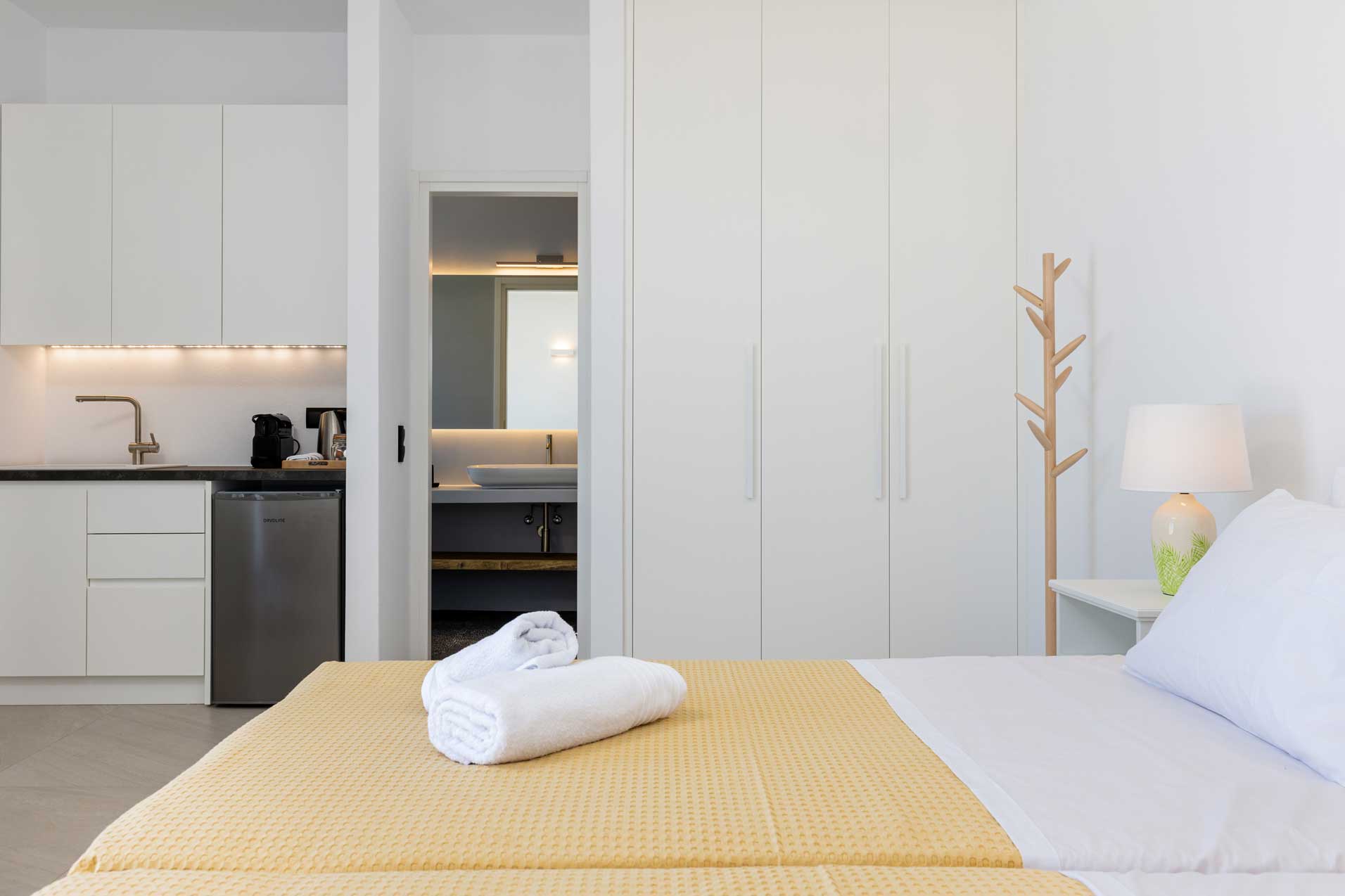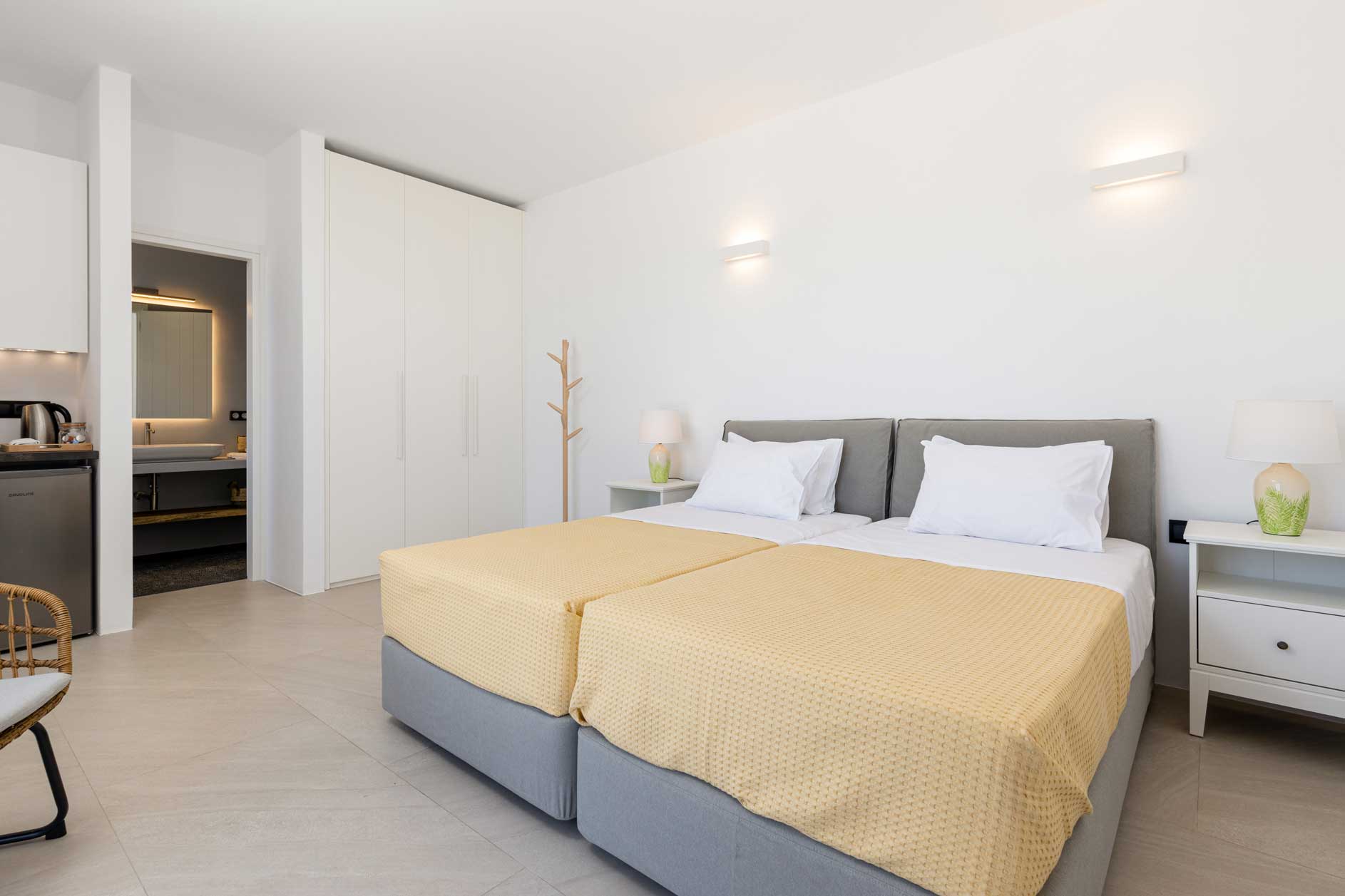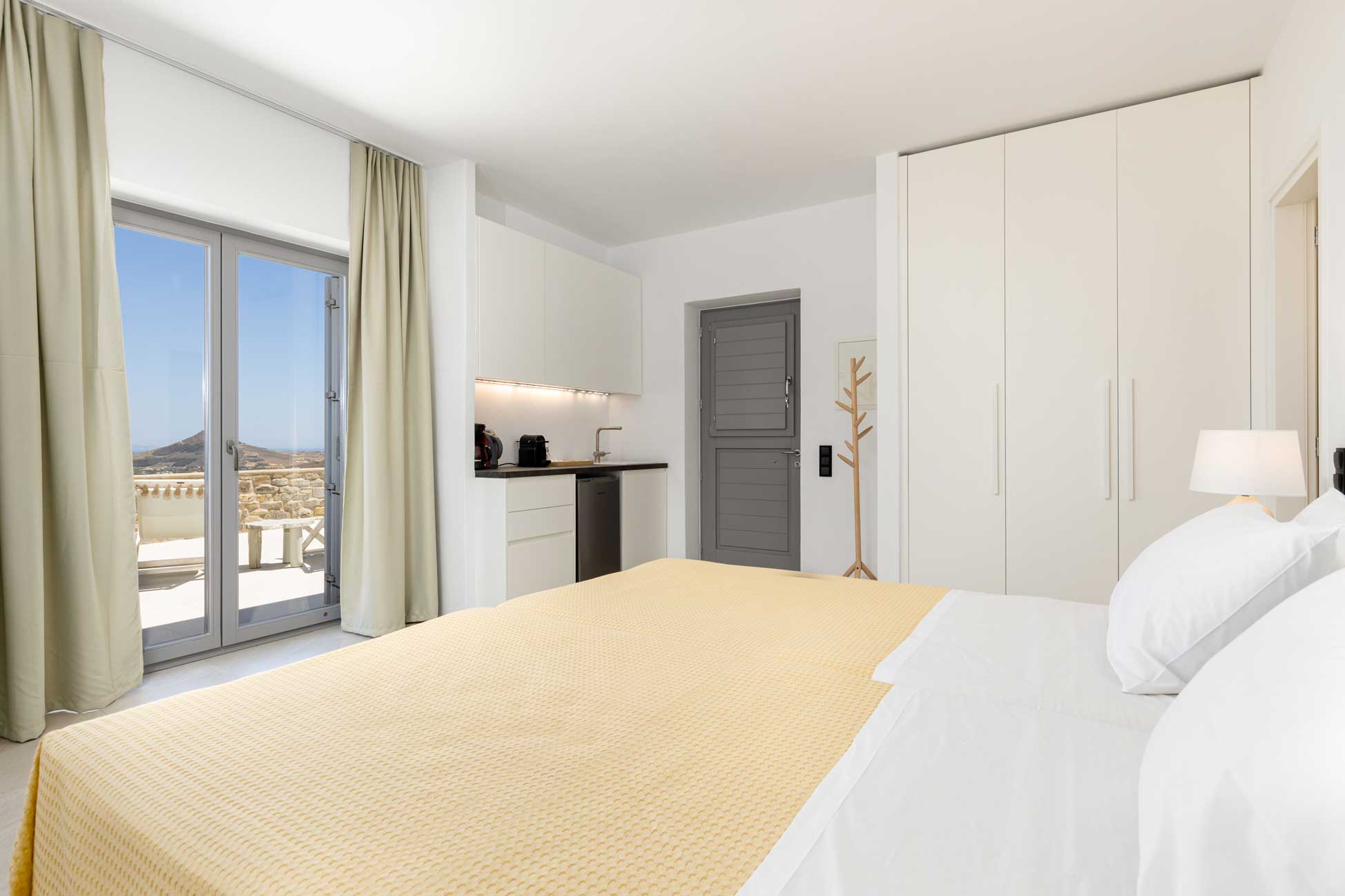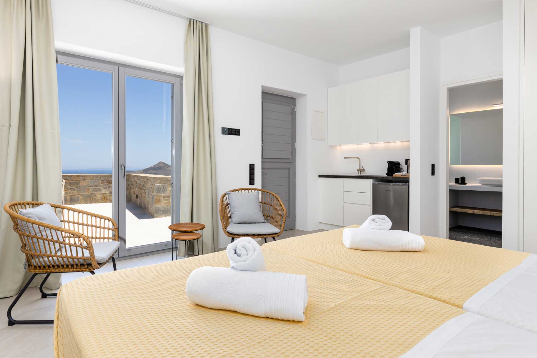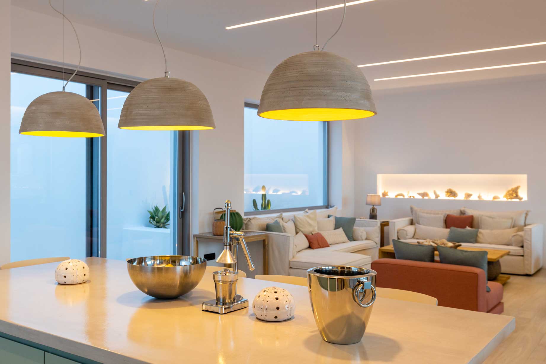 The bright and spacious living room with the dining area and the open-plan kitchen is separated from the bedrooms and offers a stunning view of the pool area, the shimmering sea, and the island of Naxos.