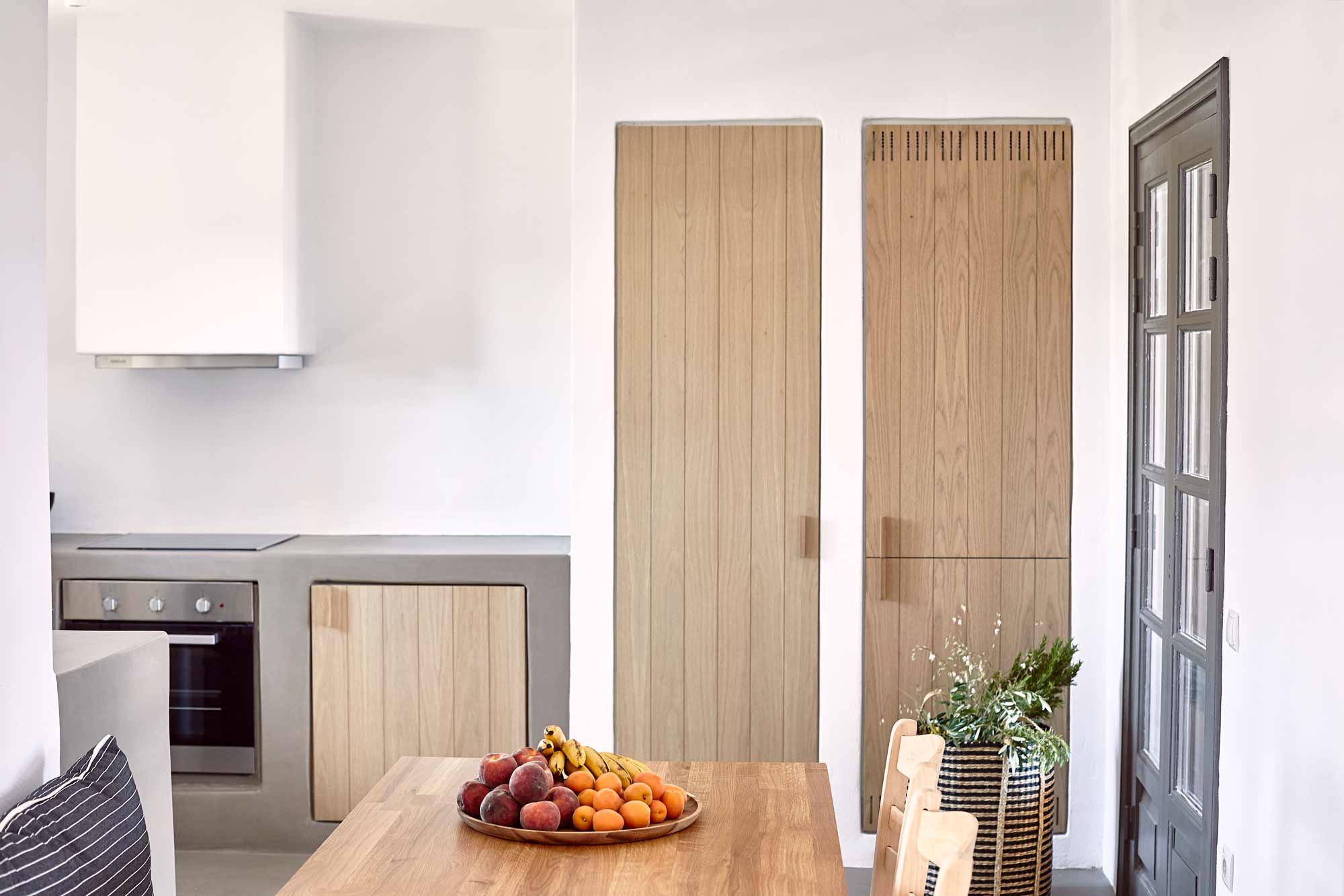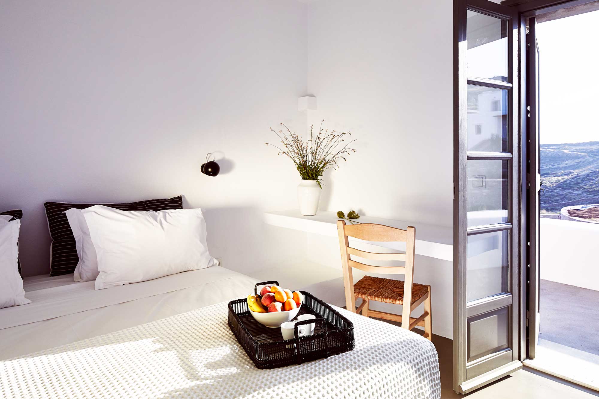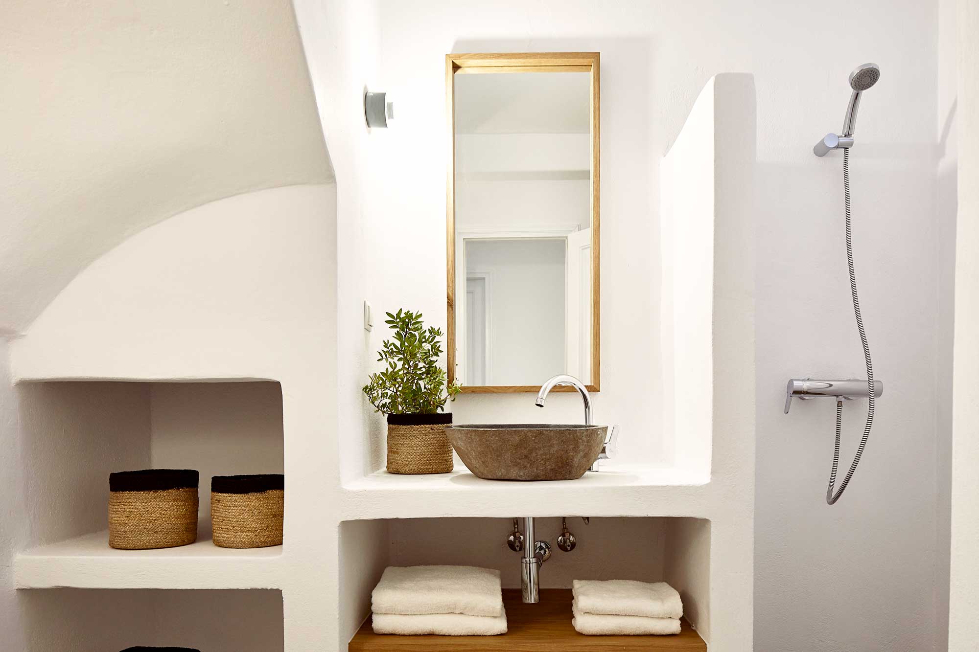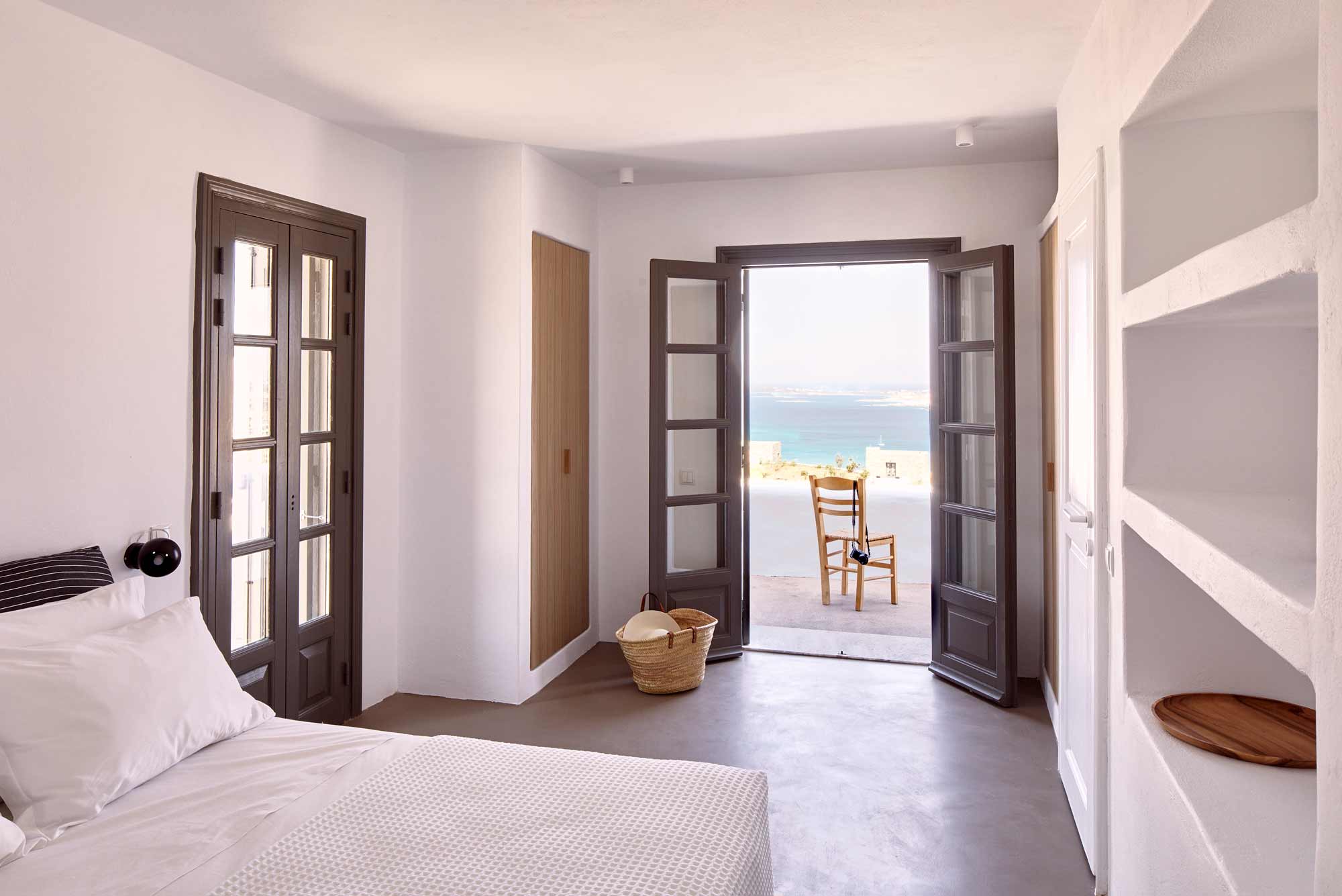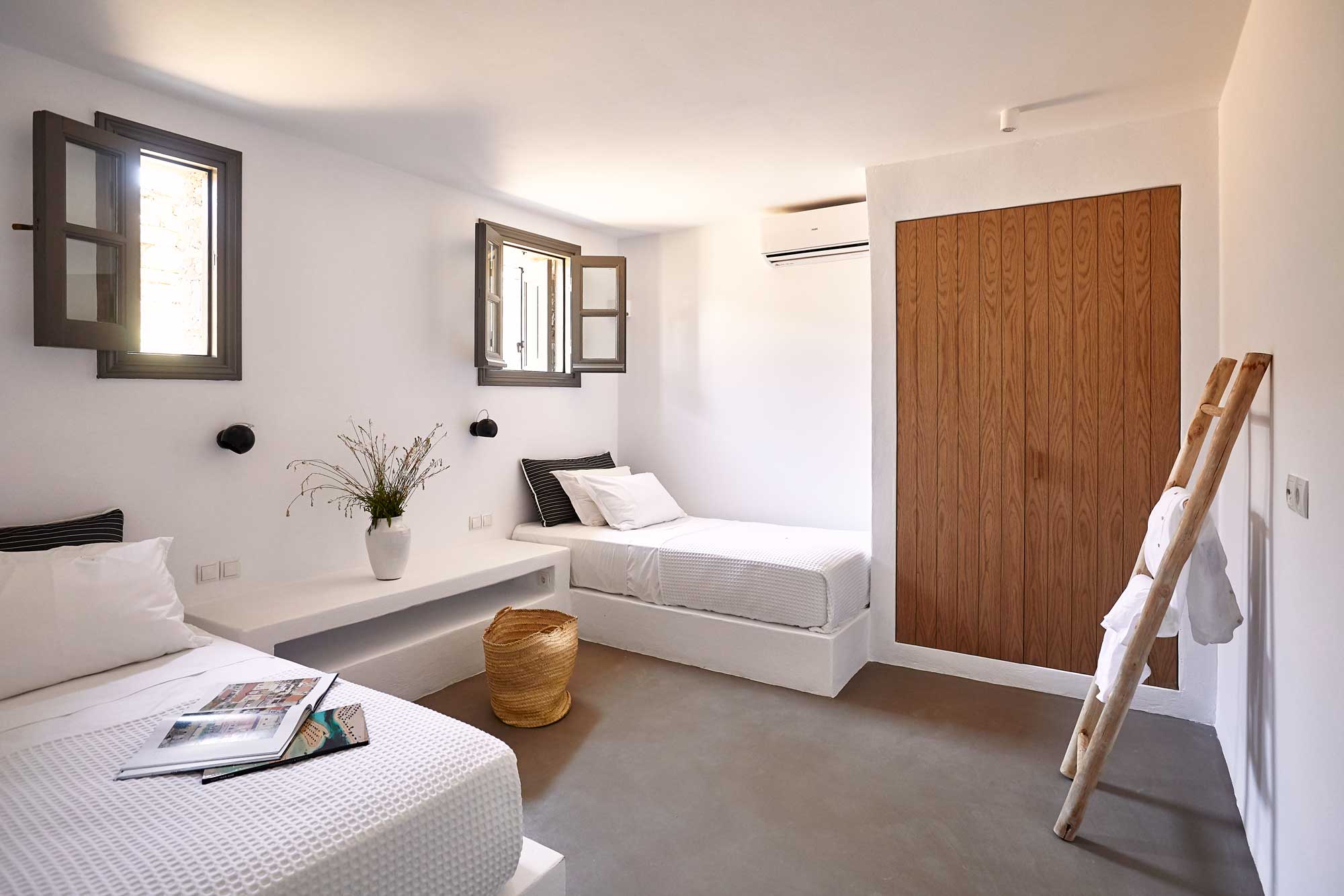 This villa, with two or three levels, offers a mix of modern comfort and Cycladic style. It has a sunny veranda connected to a well-equipped kitchen and a lower level with two bedrooms – one with a king-size bed and the other with two single beds – creating a relaxing and refined atmosphere.