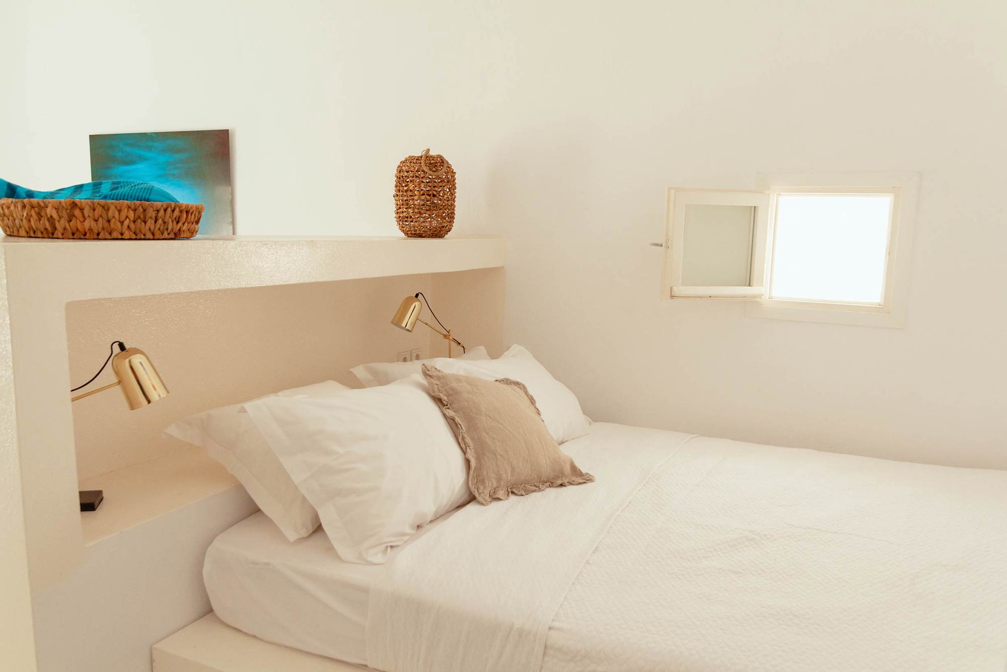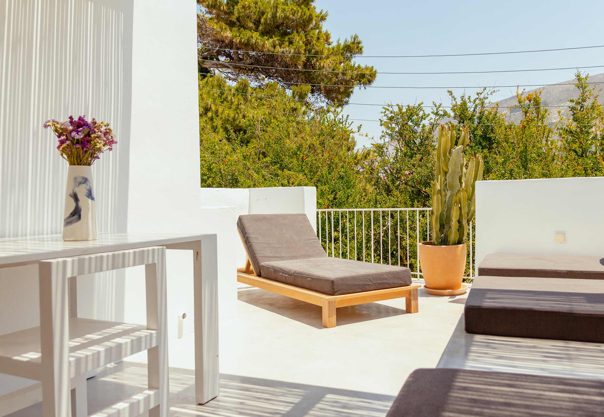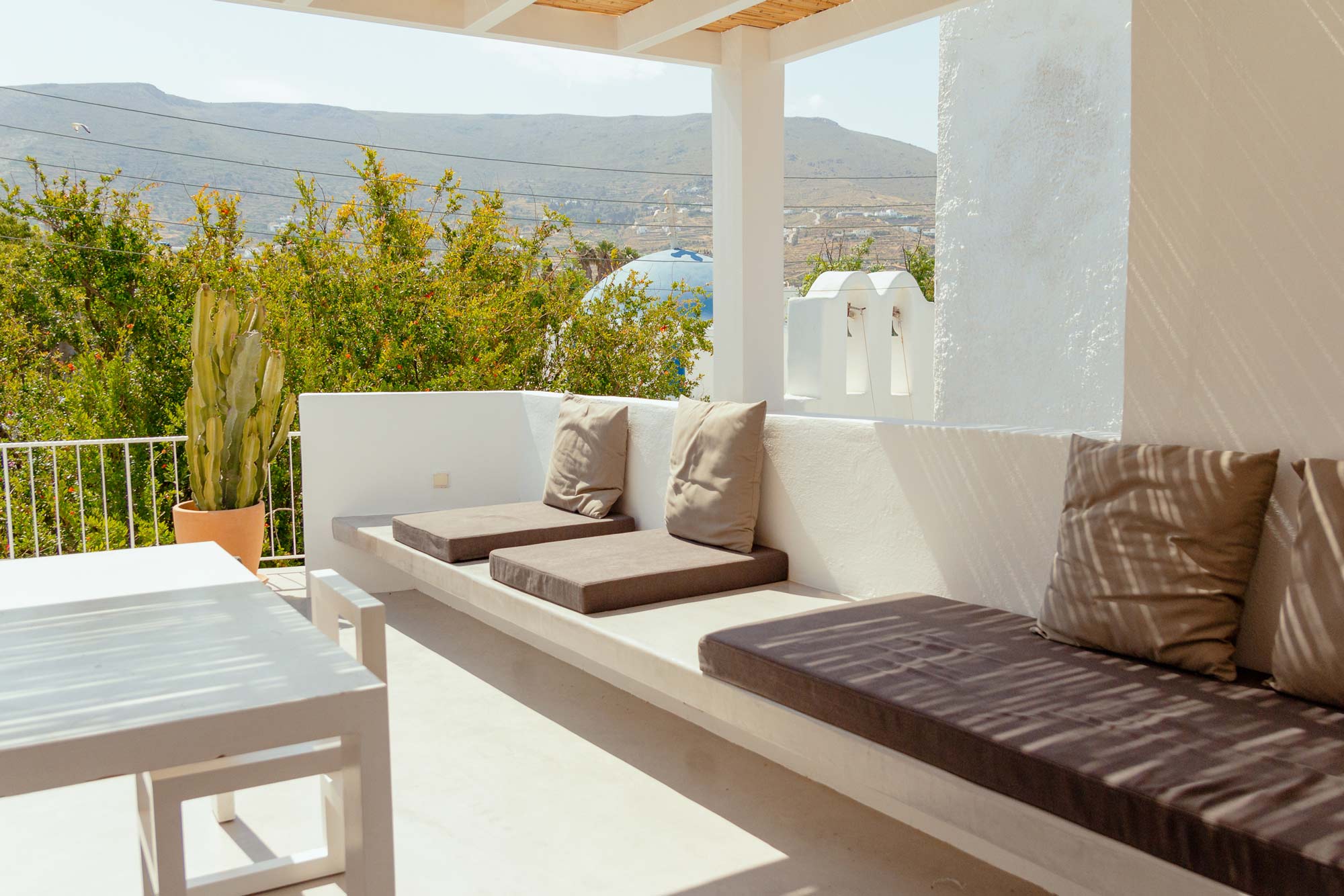 It is located in a laid back hidden alley in the centre of the old town of Parikia and just a few steps away from the pedestrian market street. The built house is embracing the island’s tranquility by offering you everything you need within a few square meters and a veranda with heart opening views over a traditional Cycladic chapel and a little park full of pomegranate trees.