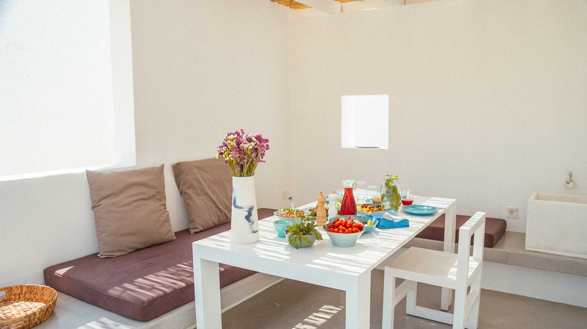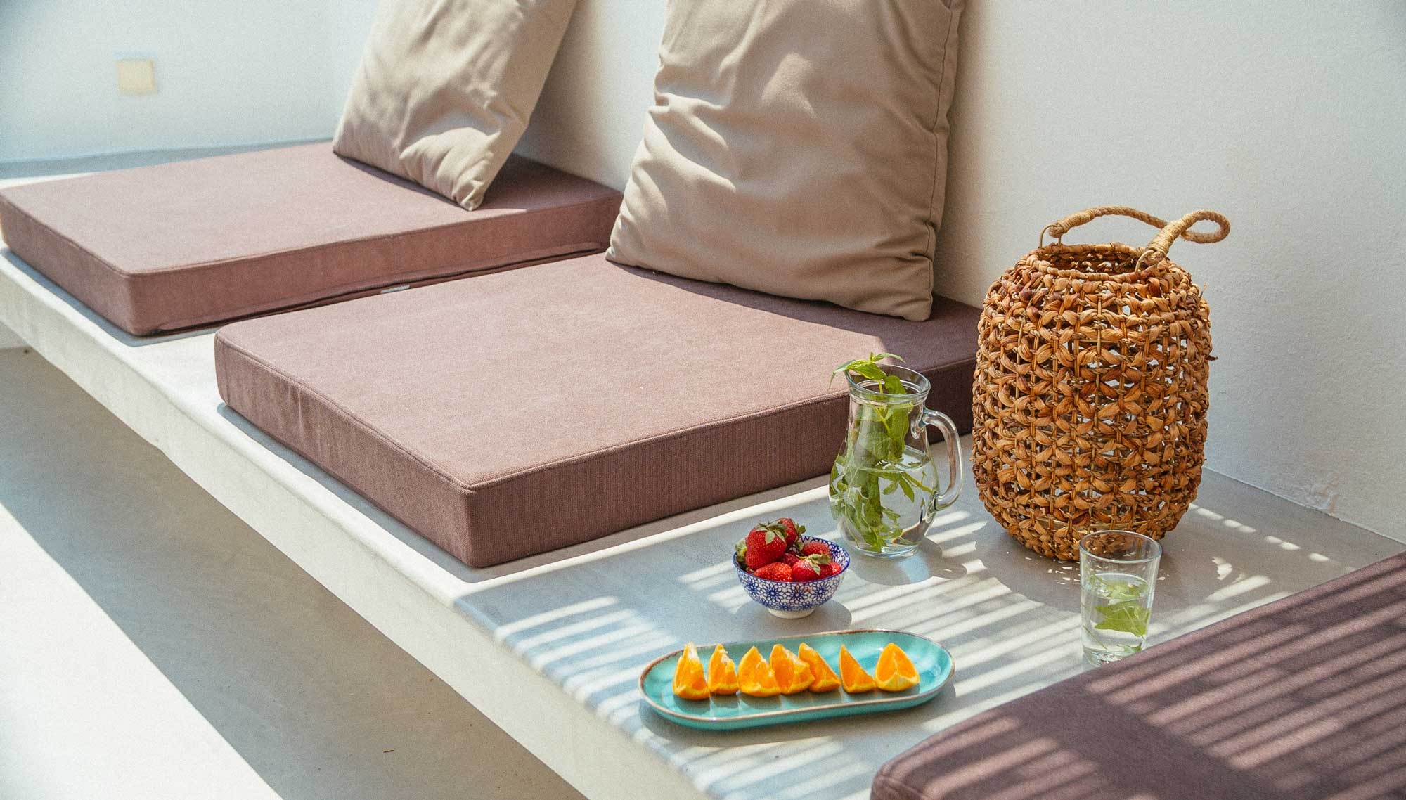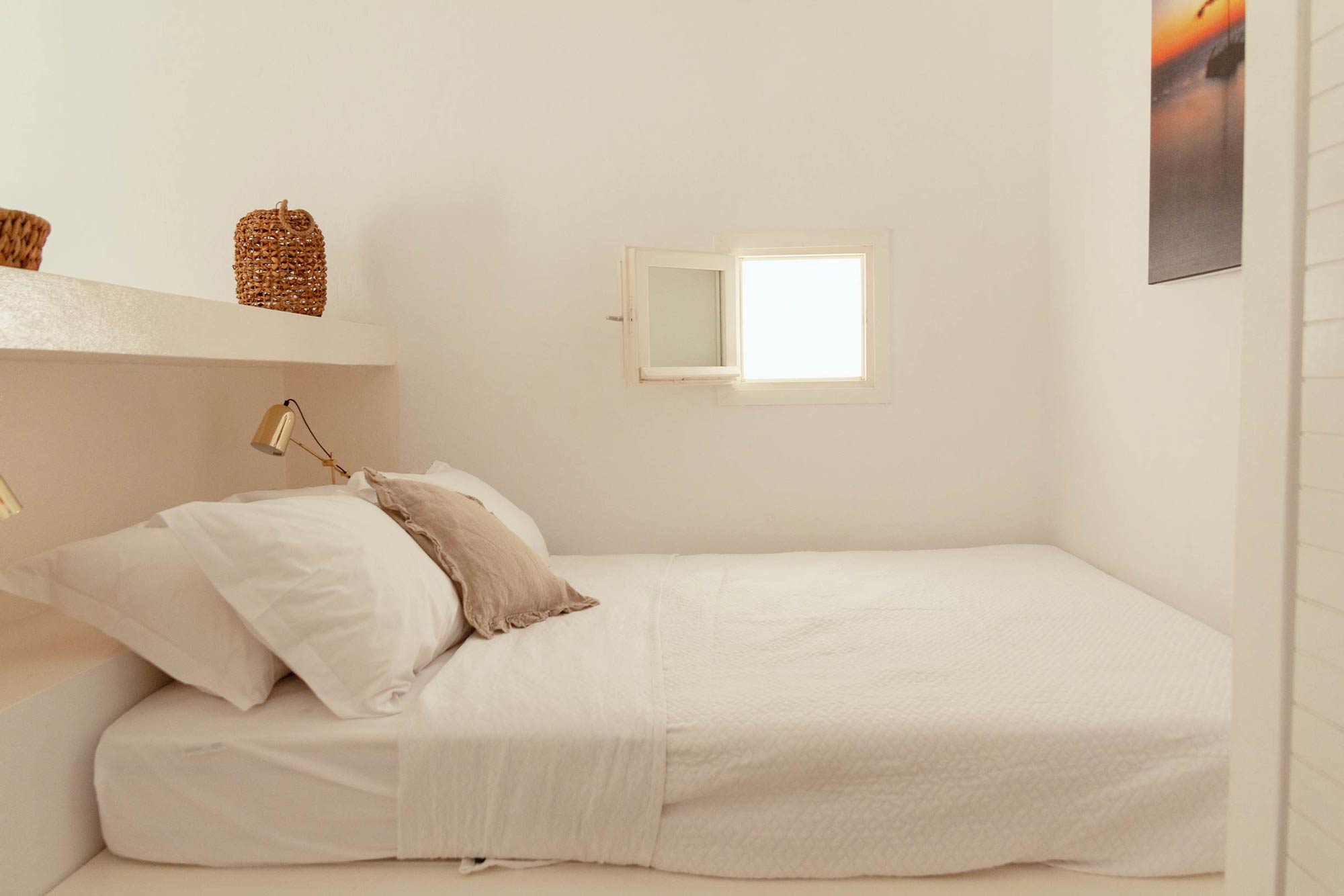 It is located in a laid back hidden alley in the centre of the old town of Parikia and just a few steps away from the pedestrian market street. The built house is embracing the island’s tranquility by offering you everything you need within a few square meters and a veranda with heart opening views over a traditional Cycladic chapel and a little park full of pomegranate trees.